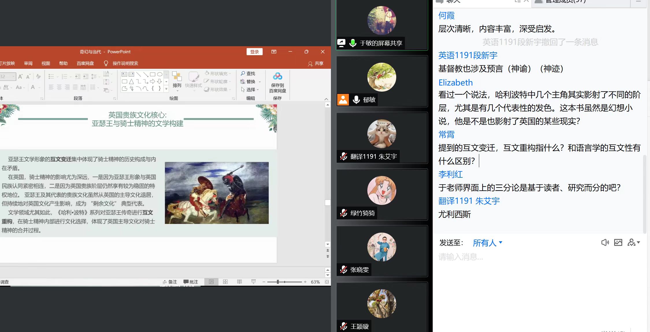 最后,就奇幻文学的当代意义,于敏博士结合英国骑士精神和亚瑟王原型在《哈利•波特》系列中的互文重构过程,通过分析小说主人公及其对手之间的“一体双生”关联与冲突本质,论述了当代英国资本主义主导文化对贵族文化的选择性吸收过程,并充分阐明了在当代西方个人主义盛行之下,罗琳尝试建构的“新骑士精神”是如何起到“责任”的约束作用的。