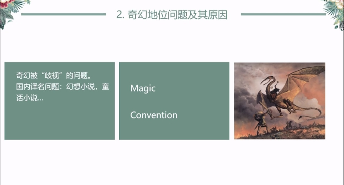 讲座伊始,于敏博士简要介绍了奇幻文学的定义和历史发展历程,展现了从托尔金和刘易斯到尼尔.盖曼和J.K.罗琳的发展脉络,并指出了奇幻文学发展中遇到的认可度和地位的问题。