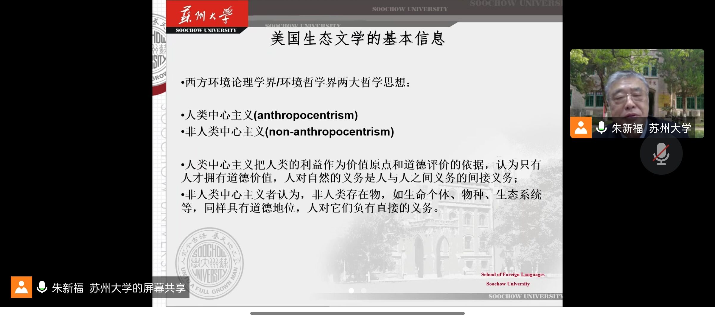 朱新福围绕美国生态文学的研究内容,着重讲解了生态文学理论探索的动向和趋势,并分析了美国生态文学的跨学科研究意义。他探讨了美国生态文学的哲学基础、文化思想基础和文学基础,详细梳理了美国生态文学在中国的发展历程,揭示了中国生态文明建设和生态理论拓展的影响,同时针对目前生态文学研究的热点和前沿问题进行了详细解读。