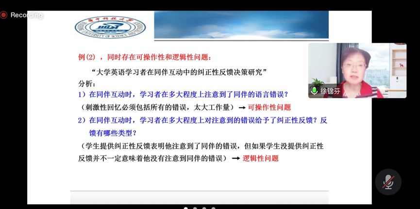 徐锦芬围绕研究设计作为实证研究选择的总体战略这一话题,介绍了实证研究的定义,并指出实证研究设计存在的常见问题。此外,她以SSCI/CSSCI刊发的文章为例,通过结合描述性研究(实验室环境)、定量研究(自然课堂)、教学实验研究(自然课堂)、混合研究设计展示了如何根据不同的研究类型进行不同的研究设计。