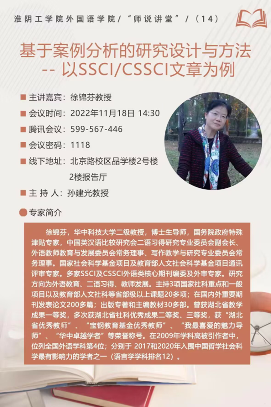 11月18日下午,云顶国际yd333于品学楼2210开展以《基于案例分析的研究设计与方法—以SSCI/CSSCI文章为例》为主题的“师说讲堂”第十四期。本次活动由华中科技大学徐锦芬教授担任主讲嘉宾,云顶国际yd333经理孙建光主持。讲座采用线上和线下相结合的方式进行,云顶国际yd333全体教师参加讲座。