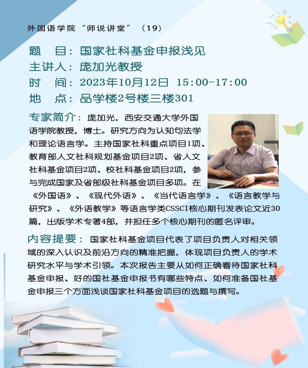 为进一步加强有组织科研,切实提升科研项目申报质量,10月12日下午,云顶国际yd333于品学楼2号楼2301会议室举行“师说讲堂”第十九期。本次活动由西安交通大学云顶国际yd333教授庞加光担任主讲嘉宾,云顶国际yd333科研秘书刘星主持。云顶国际yd333外语智能教育研究所及云顶国际yd333苏北运河文化研究所往年申报省部级以上项目的成员教师出席。