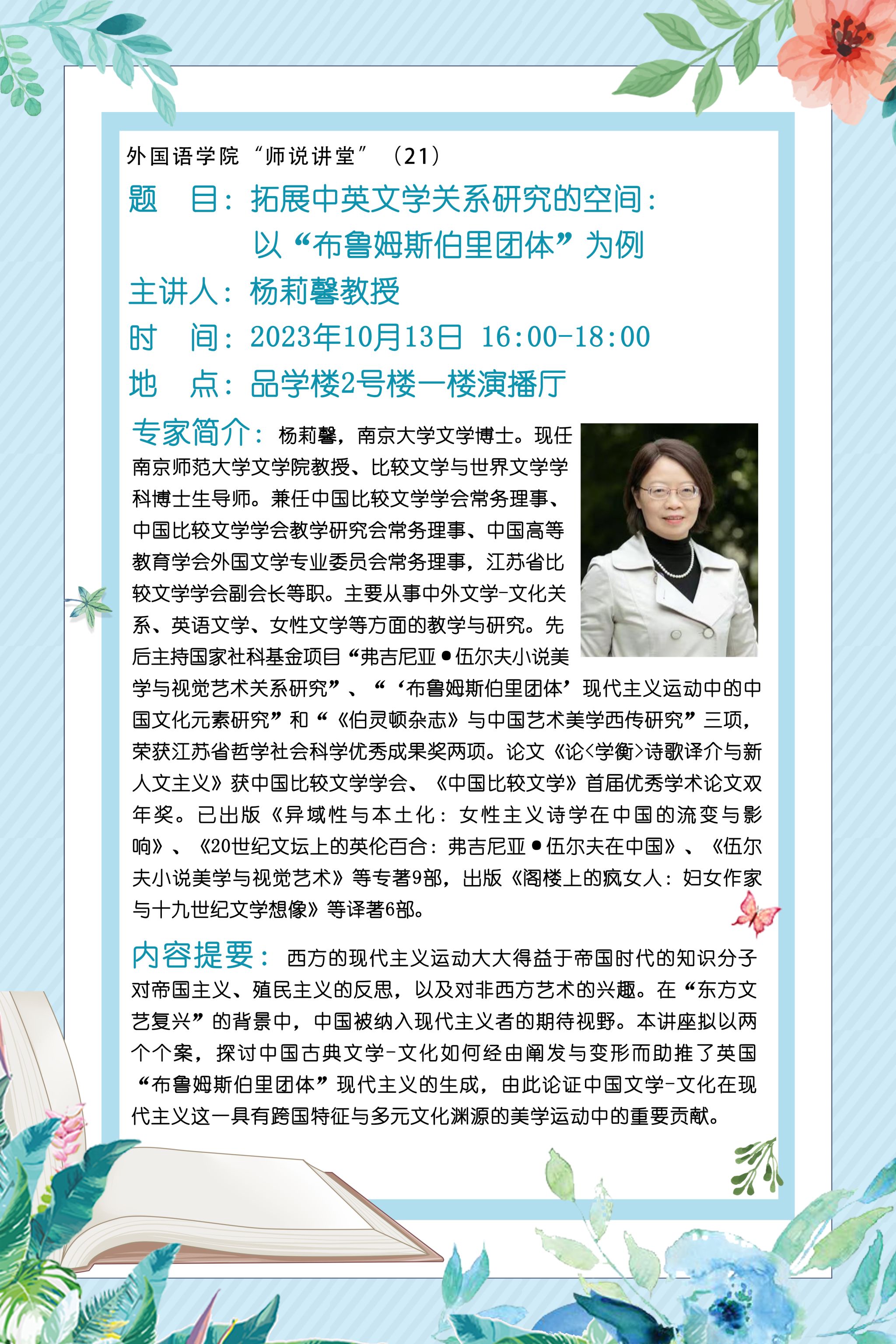 2023年10月13日下午16点,云顶国际yd333于品学楼2号楼一楼虚拟演播厅,开展以《拓展中英文学关系研究的空间:以“布鲁姆斯伯里团体”为例》为主题的“师说讲堂”第二十一期。本次活动邀请南京师范大学文公司教授、比较文学与世界文学学科带头人、博士生导师杨莉馨担任主讲嘉宾,由云顶国际yd333副经理郁敏主持,云顶国际yd333研究所成员教师及部分员工参加。