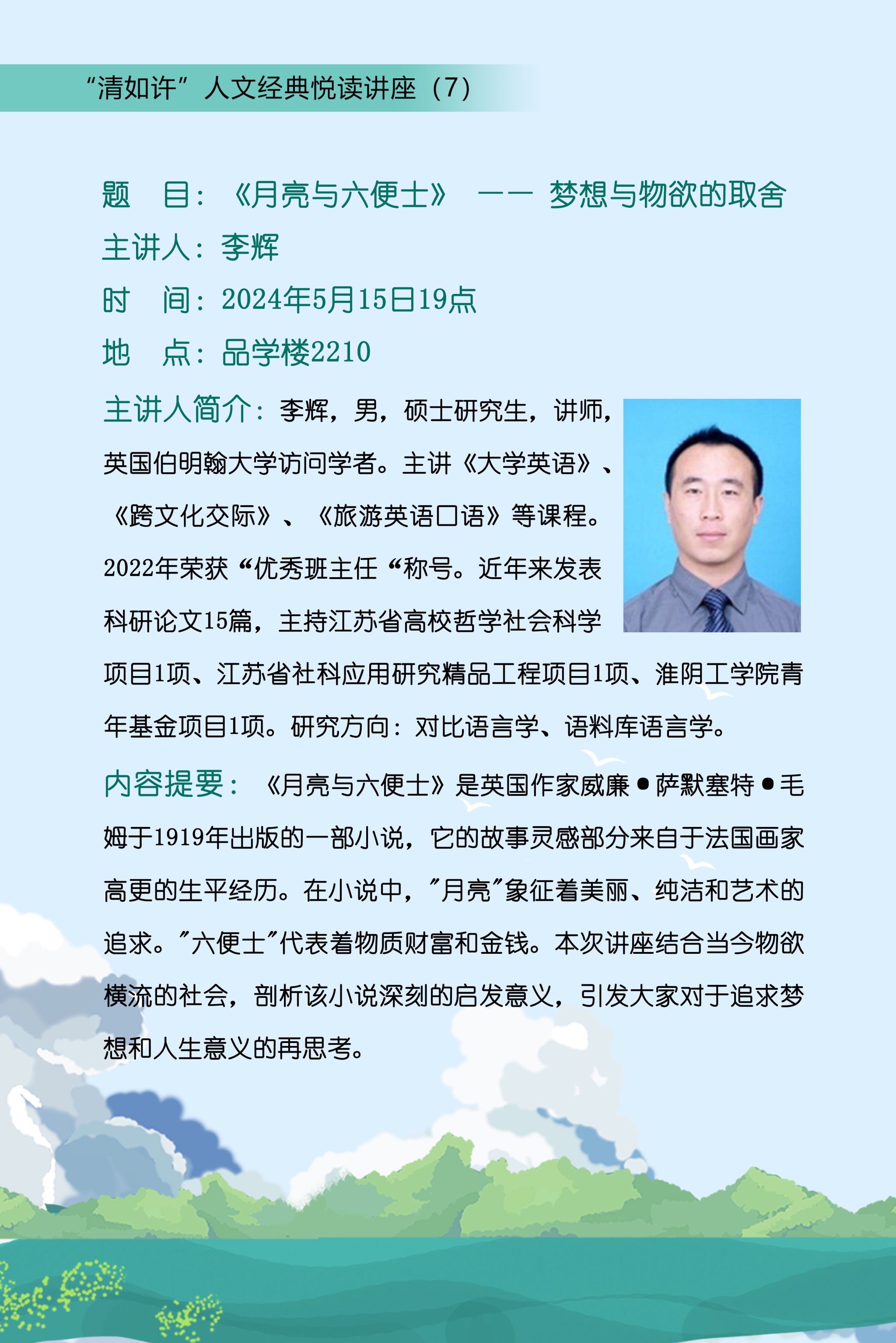 为提高员工人文素养,营造浓厚校园书香气息,2024年5月15日19时,云顶国际yd333于品学楼2210会议室举行了以“《月亮与六便士》——梦想与物欲的取舍”为主题的“清如许”人文经典悦读讲座。本次讲座由云顶国际yd333教师李辉担任主讲人,云顶国际yd333语言文化研究中心主任宋振军主持,公司全体大一员工及部分感兴趣大二、大三员工参加。