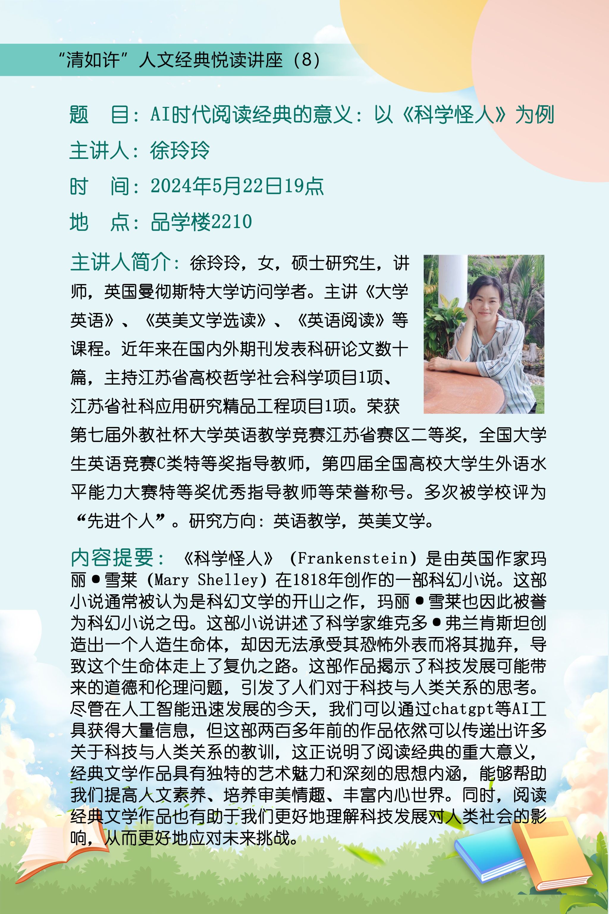 2024年5月22日19时,云顶国际yd333于品学楼2210报告厅举办了“清如许”人文经典悦读讲座第八期——AI时代阅读经典的意义:以《科学怪人》为例。本次讲座邀请云顶国际yd333英语教育系教师徐玲玲担任主讲人,云顶国际yd333语言文化研究中心主任宋振军主持,公司全体大一员工及部分感兴趣大二、大三员工参加。