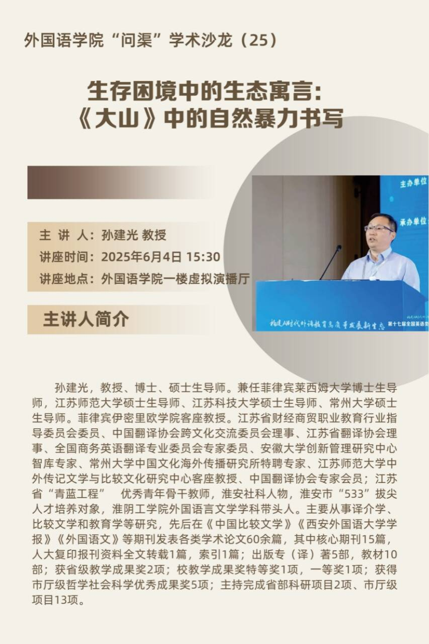 孙建光以《生存困境中的生态寓言:<大山>中的自然暴力书写》为题,首先从生态寓言视角切入,围绕生存困境主题,剖析了《大山》中自然暴力书写的呈现逻辑。接着,孙建光结合小说中的具体情节,如梦境中权力与暴力、进化与追击、抵抗与脆弱等内容,揭示了文本背后的权力结构,阐释了作者隐喻的生态伦理重建的深层意涵。最后,孙建光基于译介学、比较文学等研究视角,以本次对《大山》的剖析为范例,提出了文学研究中生态主题挖掘、文本深度解读及跨学科研究融合的实践路径。
