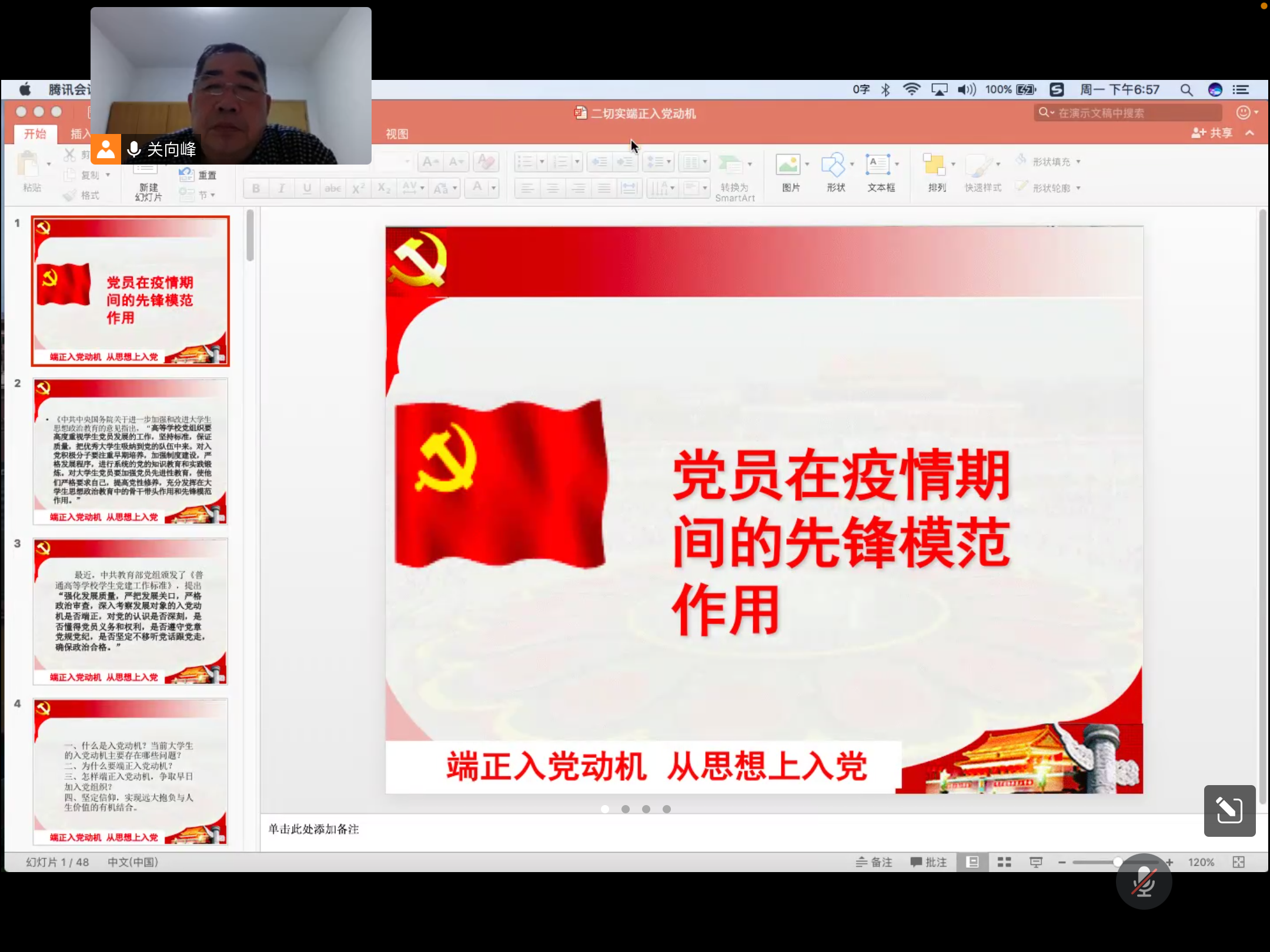 11月28日晚,云顶国际yd333于腾讯会议开展主题为“党员在疫情期间的先锋模范作用”的入党积极分子培训。校关工委成员关向峰老师担任主讲人,各年级优秀入党积极分子参加。