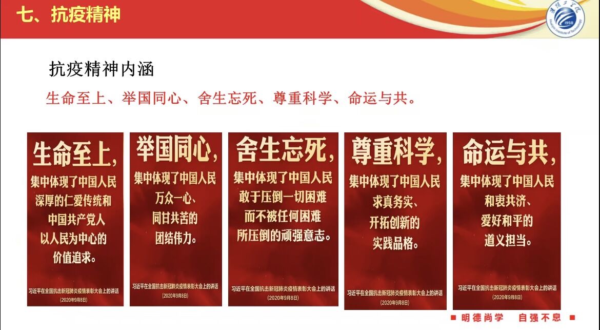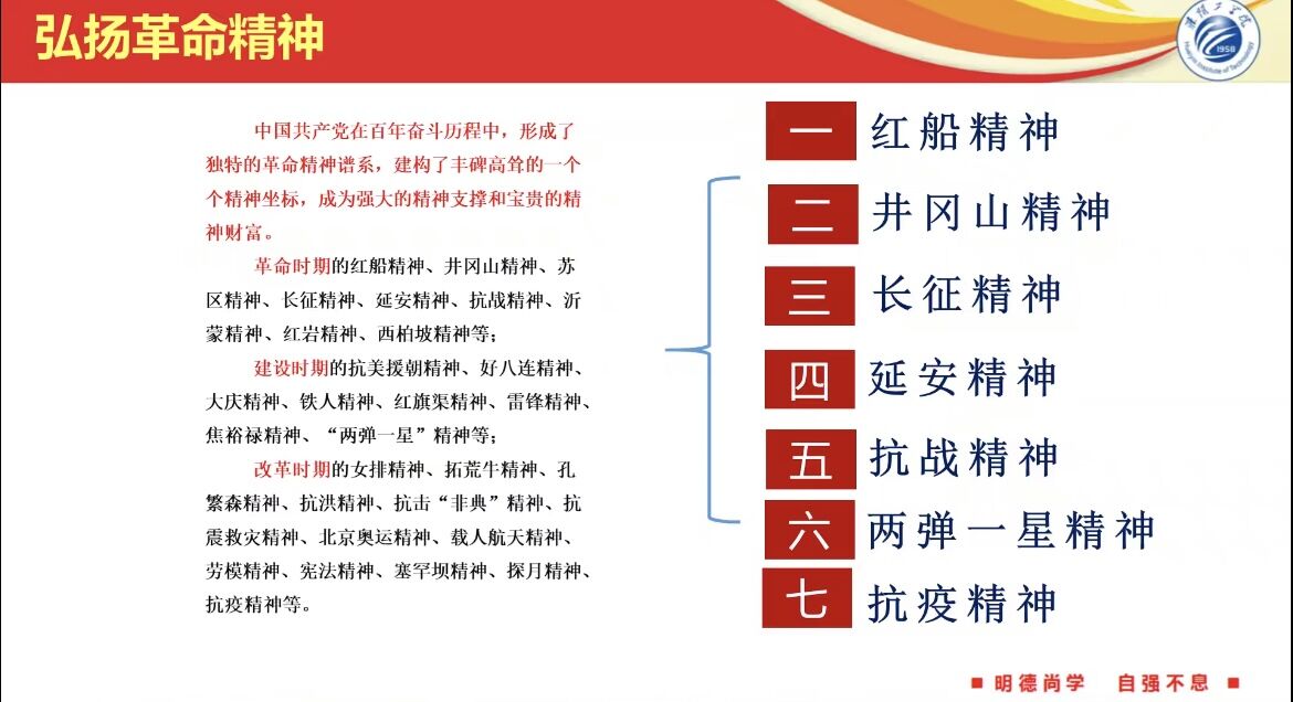 李炜表示,一百年来,中国共产党弘扬伟大建党精神,在长期奋斗中构建起中国共产党人的精神谱系,锤炼出鲜明的政治品格。接着,他围绕“井冈山精神”,“长征精神”,“抗战精神”,“抗疫精神”等精神分别介绍了其背景,内涵和缔造者。最后,李炜勉励同学们坚定执着追理想,实事求是闯新路;艰苦奋斗攻难关,依靠群众求胜利。