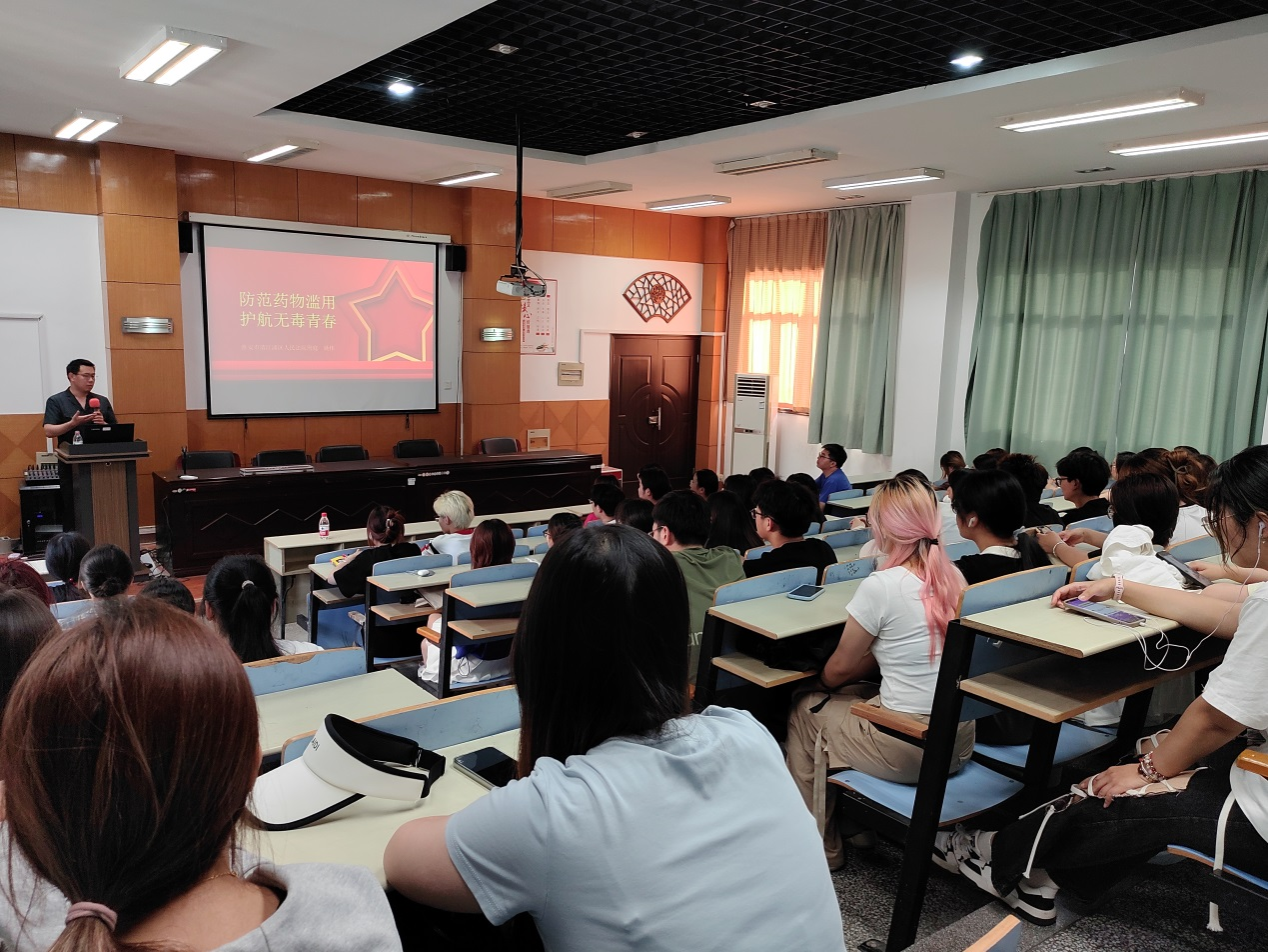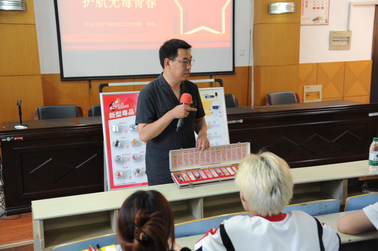 活动中,清江浦区法院刑庭姚伟副庭长宣讲了禁毒法律法规、科普禁毒知识、传播禁毒理念、弘扬禁毒精神,重点介绍了近年来出现的新型毒品,并用一个个真实的案例向同学们介绍了毒品的危害,深刻阐述了远离毒品的重要意义。活动现场设置了禁毒展板,与同学们进行了互动交流,气氛活跃。