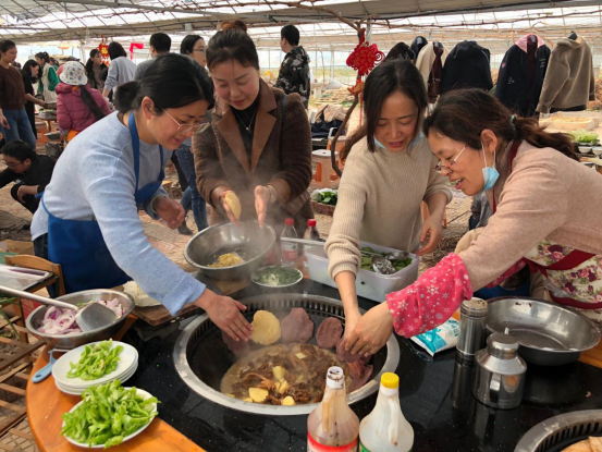 采摘后女教师们按照提前分配好的队伍,分工落实专人安排菜谱、选择食材,在3个大土灶前亲自动手体验土灶烧菜,切菜备菜、砍柴烧火、蒸煮煎炒,大家井然有序,团结协作,一派热火朝天的景象。女神们争相展示自己的厨艺,娴熟的翻炒技术,将各自的拿手菜一一呈现。大家一边畅聊自己在工作和生活中遇到的趣事,一边品尝一道道美味佳肴,工作与生活中的压力得到了充分的释放。
