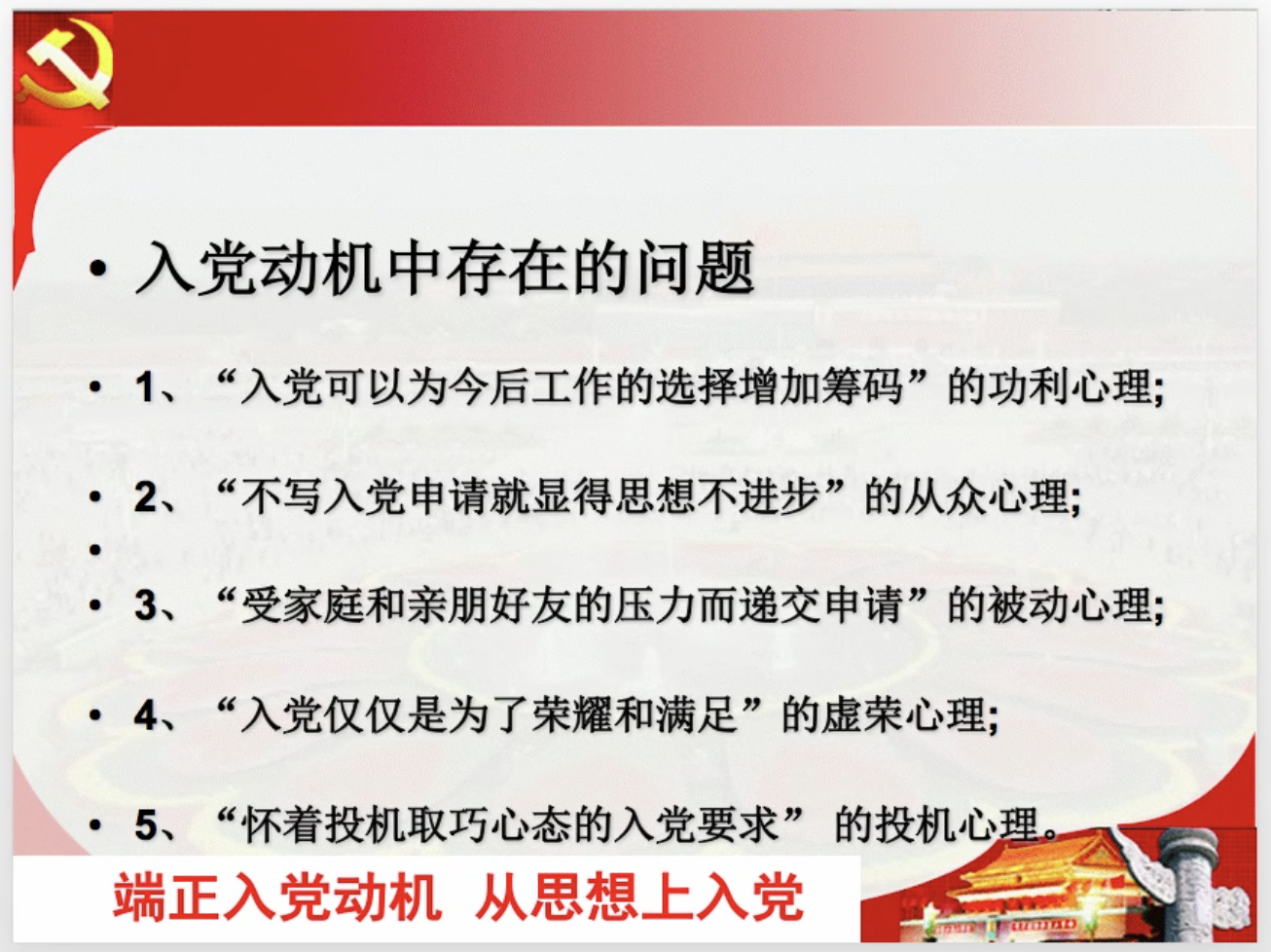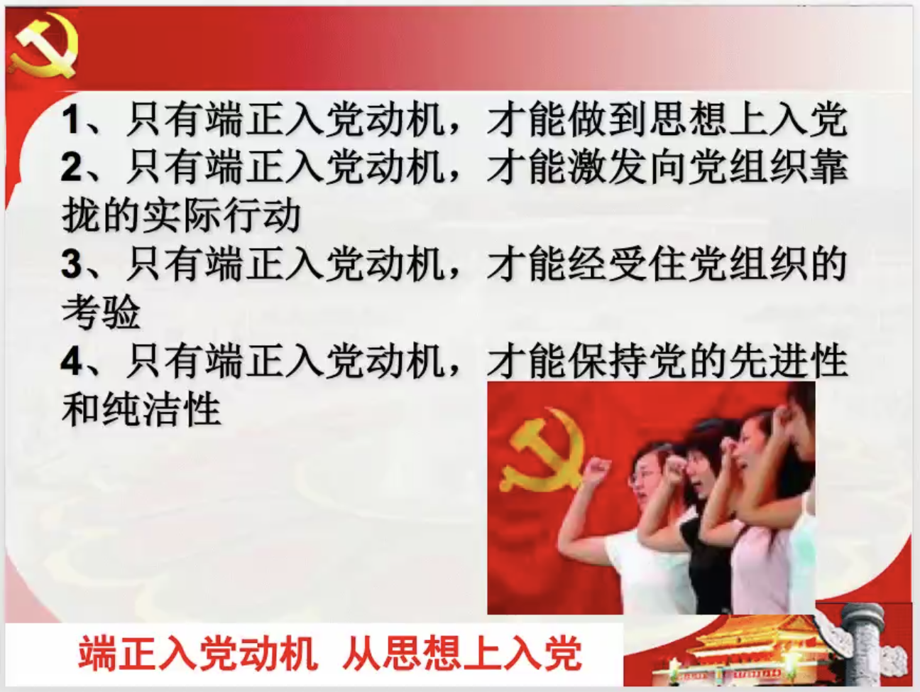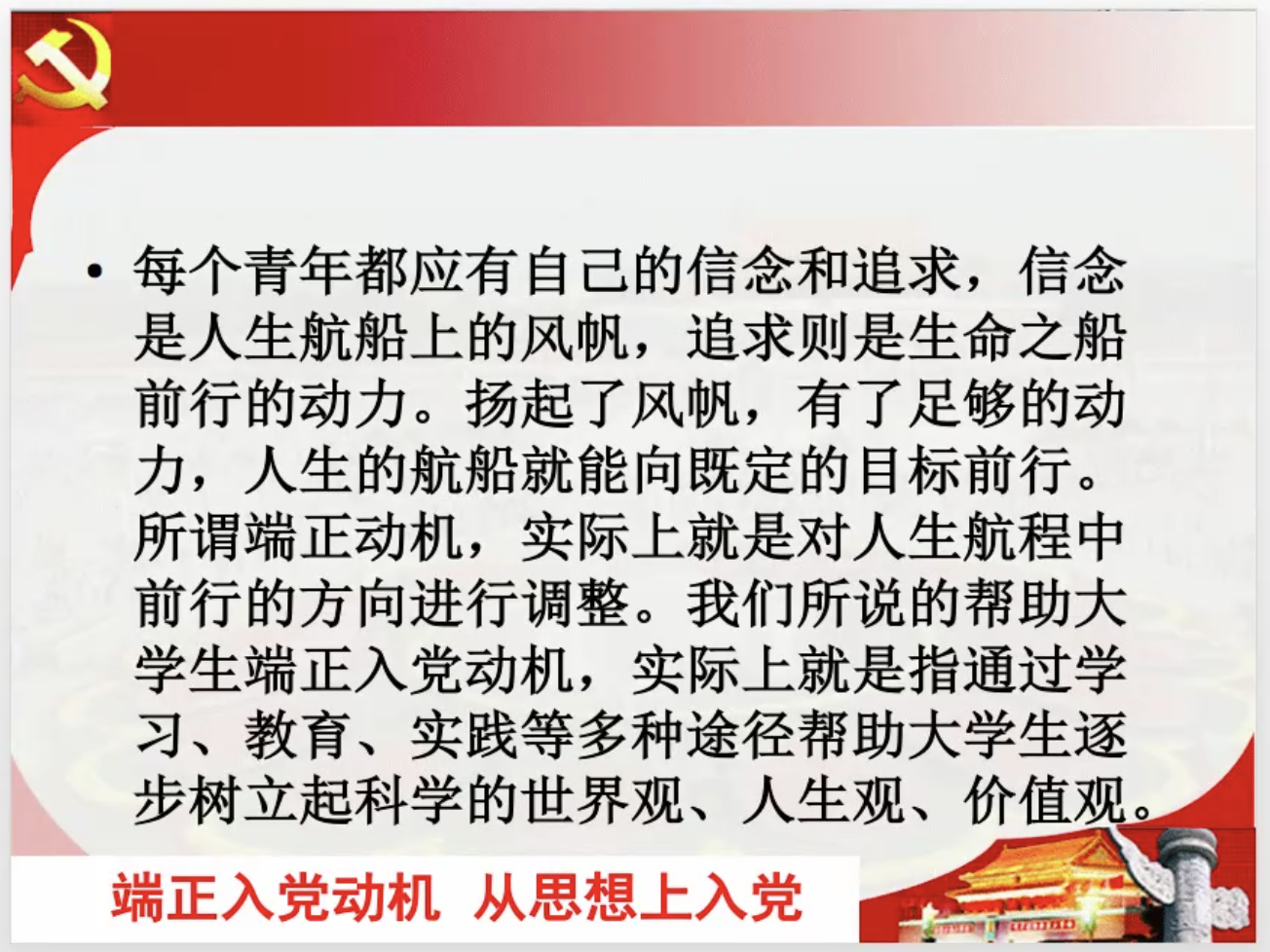 首先,关向峰老师结合个人经历和大家解释了什么是正确的入党动机。入党动机的真正含义是一个人要求入党的原始心理要求和真实的意图和目的。他指出每个青年都应有自己的信念和追求,真正了解到入党动机中存在的问题。其次,他和同学们讨论了端正入党动机的原因以及怎样端正入党动机,并争取早日加入党组织。同学们应当充分认识党的先进性,从内心热爱党,拥护党;切实加深正确的入党动机的理解;积极创造条件,自觉接受党组织的考验。最后,关向峰老师希望同学们坚定信仰,实现远大抱负与人生价值的有机结合。