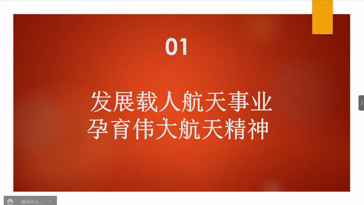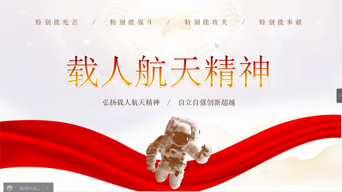 会议伊始,副经理郁敏围绕载人航天事业的发展介绍了航天精神。她强调航天事业的精神核心是“特别能吃苦、特别能战斗、特别能攻关、特别能奉献”。此外,她结合航天精神鼓励同学们从精神中学习到知识,改正自己。会议最后,副经理郁敏呼吁同学们应当发奋图强,志存高远,努力学习,拒绝躺平。