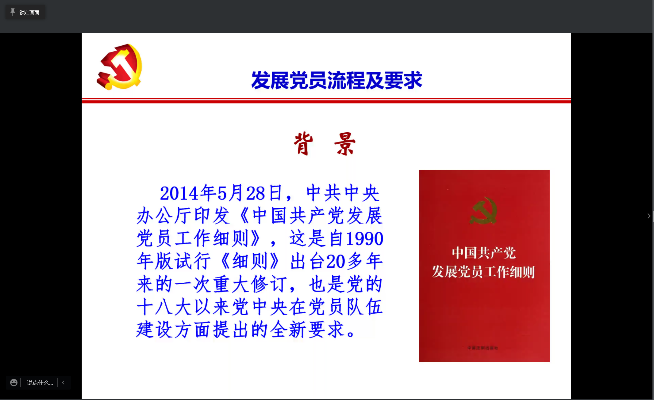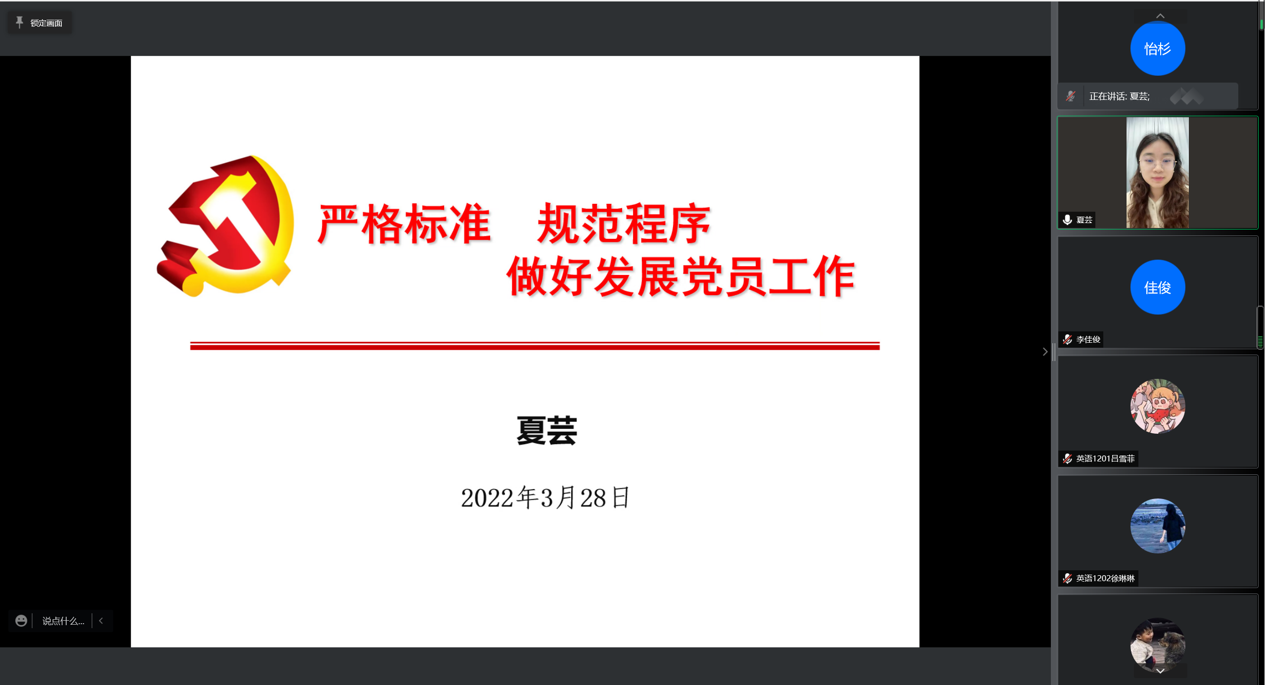 为贯彻落实党史学习教育动员大会精神,2022年3月28日19:00,云顶国际yd333于线上开展主题为“严格标准,规范程序,做好发展党员工作”的党团课,团委书记夏芸担任主讲人,各班级入党积极分子积极参加本次党团课。