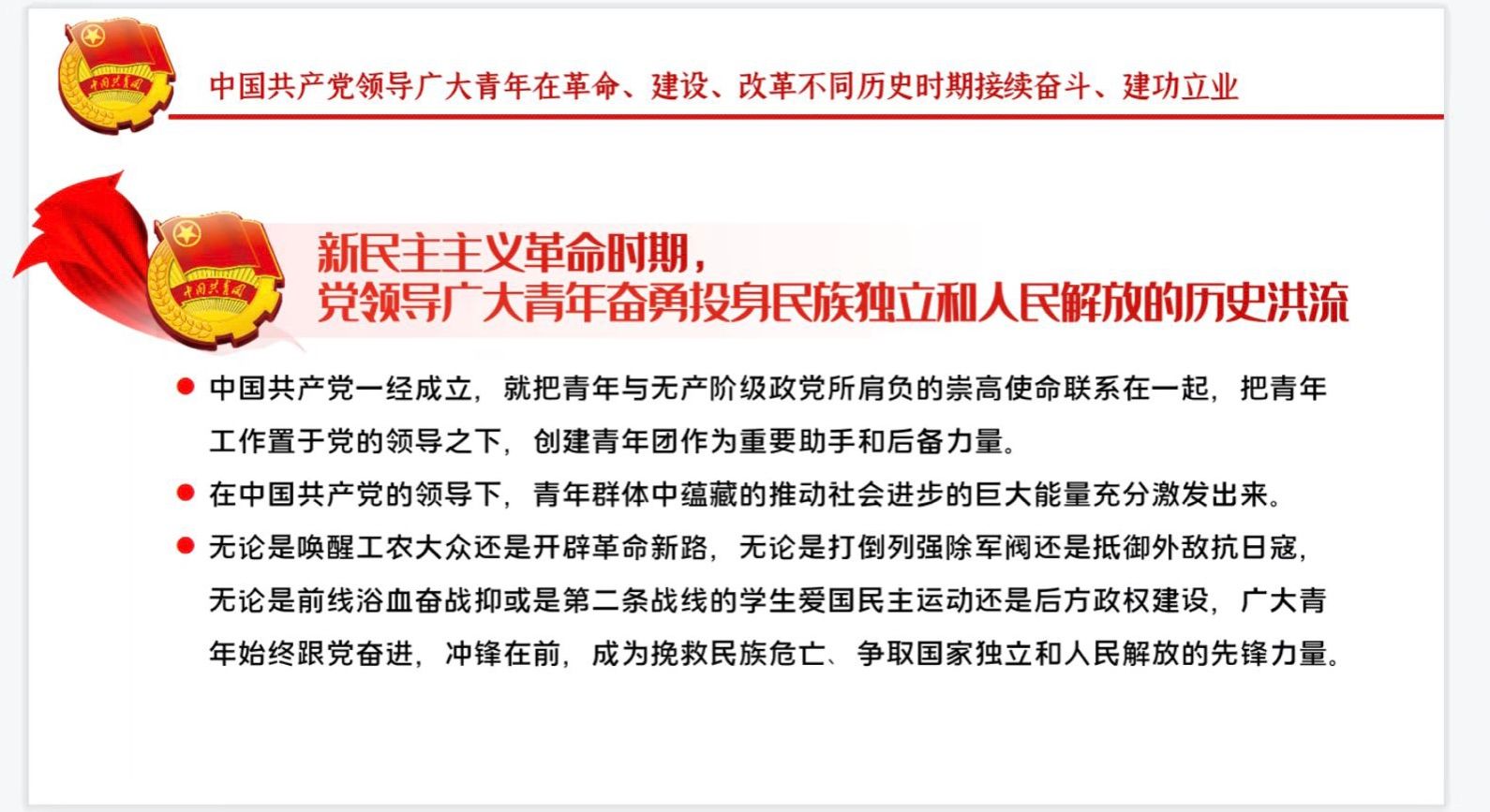 会议中,朱胜男对中国共产党领导广大青年在革命、建设、改革不同历史时期接续奋斗、建功立业、关于青年工作的重要思想引领新时代中国青年运动书写崭新篇章以及百年中国青年运动历程的启示三方面进行讲解。最后,朱胜男对全体学员提出希望。她表示,作为新时代青年,应有理想、有追求、有担当,用青春书写无愧于时代、无愧于历史的华彩篇章。