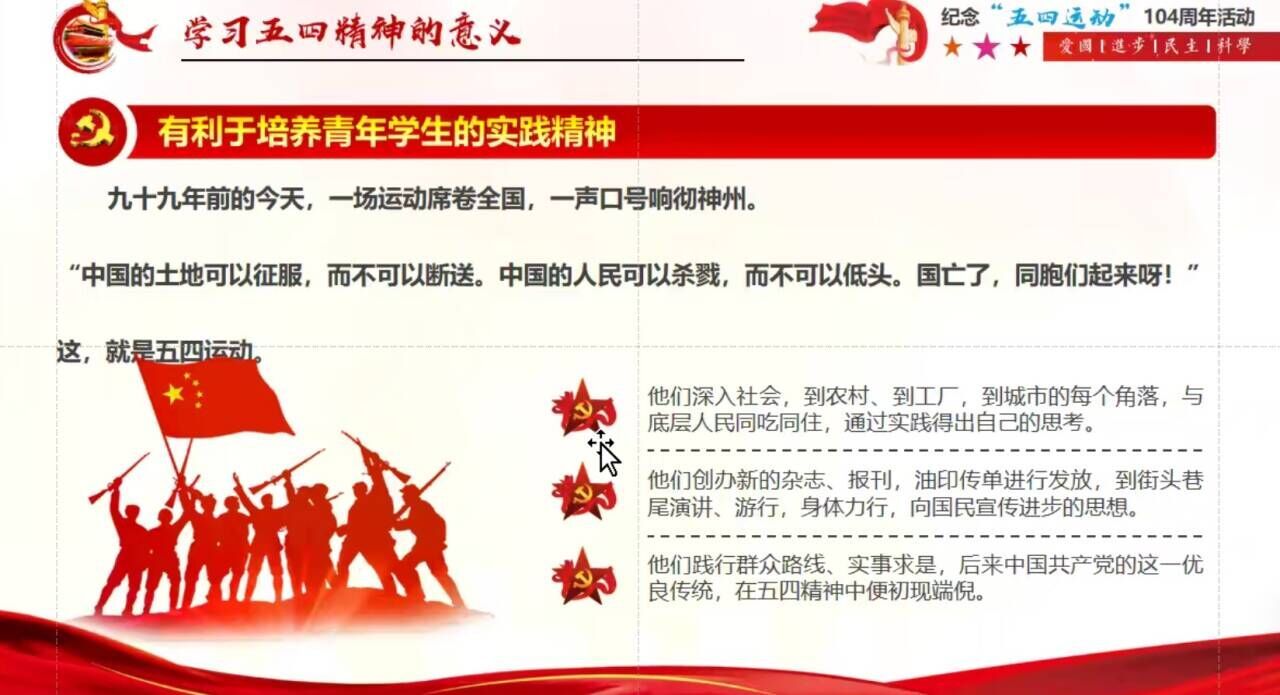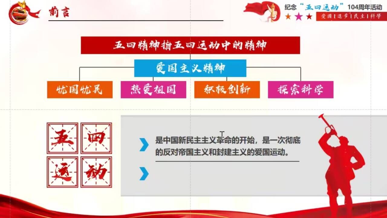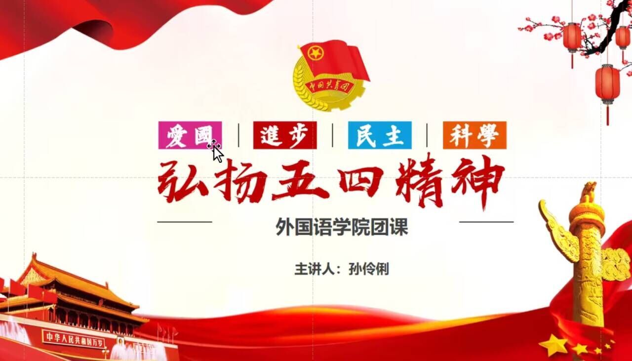 2024年5月13日下午七点,云顶国际yd333于线上开展主题为“弘扬五四精神”的青马工程培训课,由学工办主任孙伶俐担任主讲人,云顶国际yd333各年级优秀学子参与。