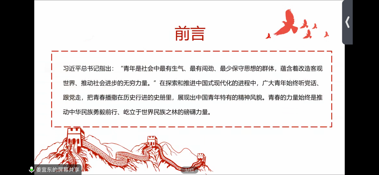 姜宜东首先引用习近平总书记的话“青年是社会中最有生气、最有闯劲、最少保守思想的群体,蕴含着改造客观世界、推动社会进步的无穷力量”表示青年是中华民族的磅礴力量。接着从“时代赋予了当代青年人怎样的历史使命”、“当代青年人的时代价值”、“总书记对新时代青年人的要求”、“面对时代大任,我们该怎么做”、“争做堪当民族复兴重任的时代新人”等五个方面展开论述,呼吁新时代青年始终听党话跟党走,展现中国青年特有的精神风貌。