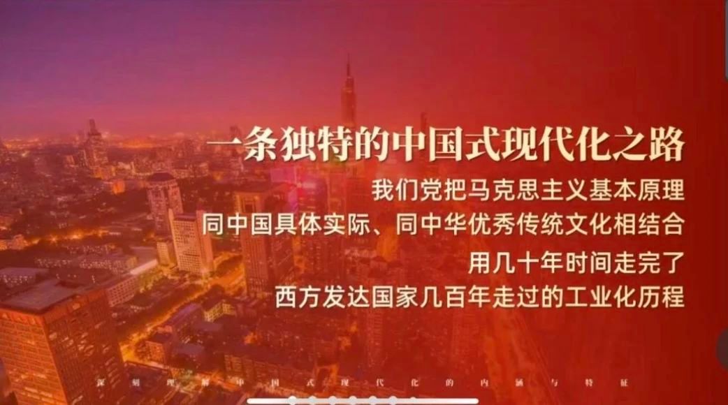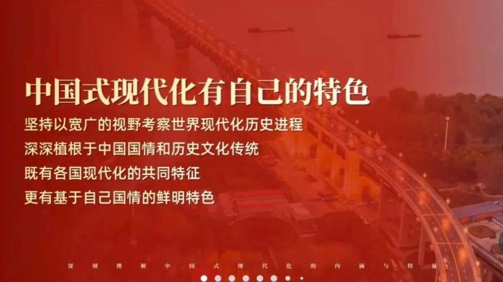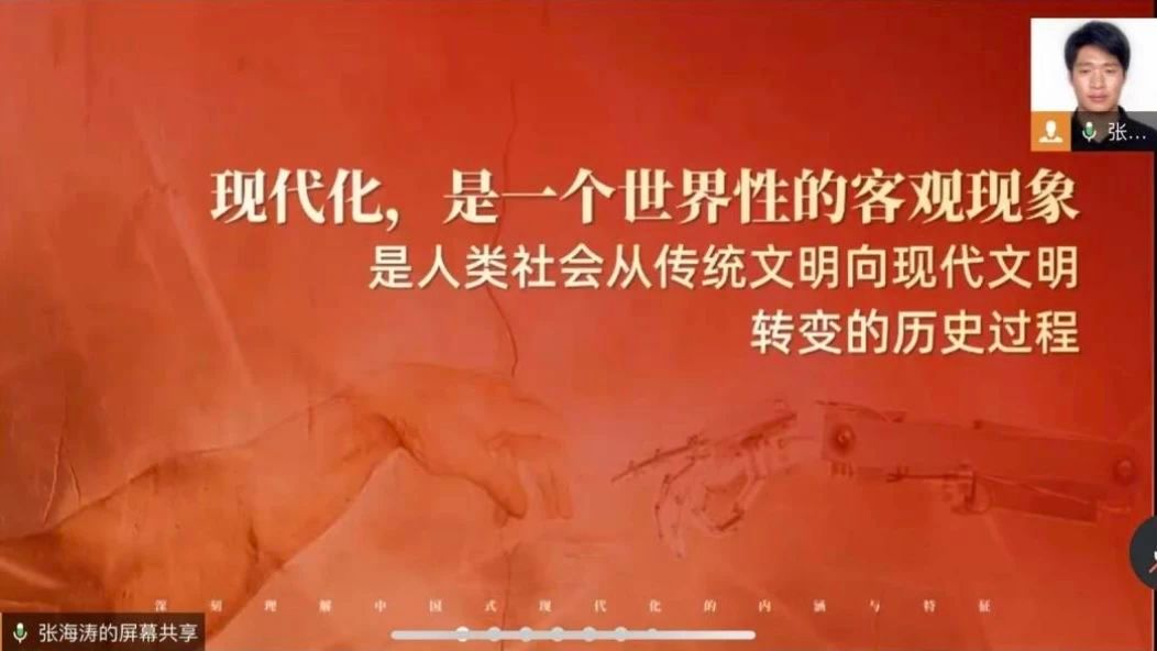 首先,张海涛以“什么是现代化”为引,从现代化的定义出发,导入团课主题。然后,张海涛具体介绍了了何为“中国式现代化”以及中国共产党是如何在艰难困苦中逐步推进中国式现代化的。他系统阐述了中国式现代化的科学内涵:立足中国实际,以独立自主的探索精神开辟社会主义现代化新路,既遵循现代化普遍规律,又依托社会主义制度优势,在人口规模巨大的国情基础上,创造性确立了五大核心特质:以共同富裕为价值内核,推动物质文明与精神文明协调发展,构建人与自然生命共同体,坚持和平发展道路,形成了既具有现代化共性、又彰显中国特色的新型发展范式。这种现代化走出了一条扎根中华大地、契合国情民意、引领文明进步的自主发展道路。