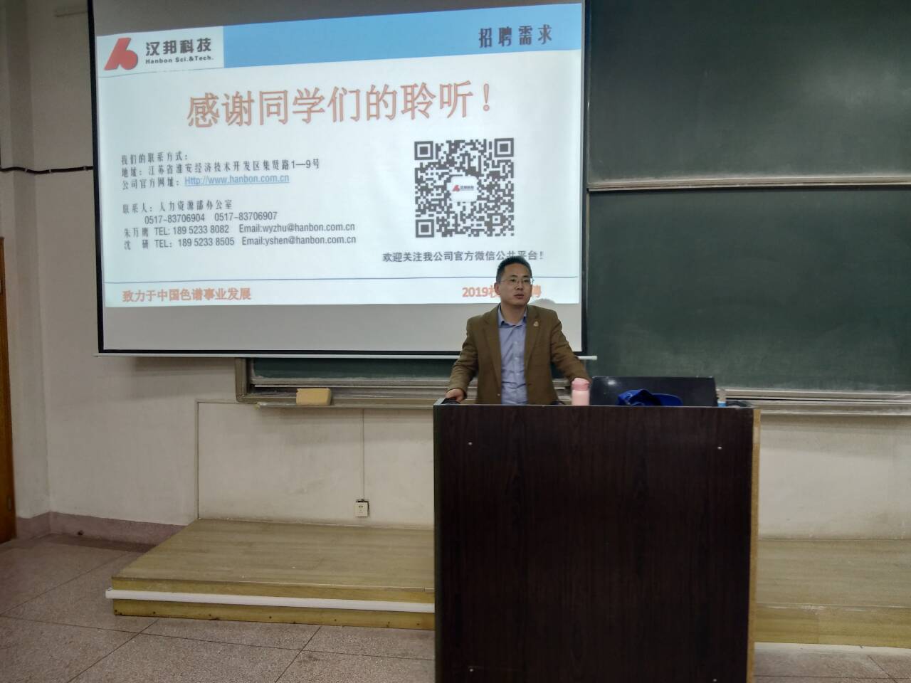 首先,朱经理先做了简短的自我介绍,接着向同学们介绍了汉邦科技集团的发展历程,谈到该公司是集研发、生产和贸易为一体,以液相色谱产品为核心的高新技术企业,并展示了他们的主要客户集锦。随后,朱经理说到公司在工作之余丰富的企业集体活动和不错的薪酬福利。最后,陈总详细介绍了汉邦科技集团本次招聘会的主要招聘岗位——人事部、翻译、销售并诚心邀请有意向的大四员工可以当面咨询。