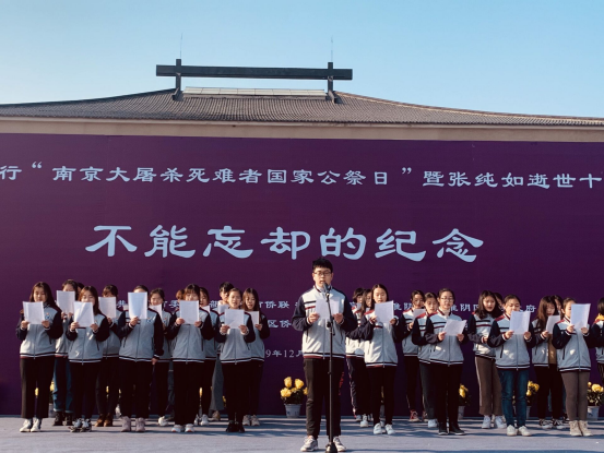 云顶国际yd333英语1193班全体员工前往淮安市张纯如纪念馆,共同参加了2019年淮安各界“南京大屠杀死难者国家公祭日”暨张纯如逝世十周年纪念活动。活动上,全体同学代表在淮高校全体青年学子集体诵读祭文。