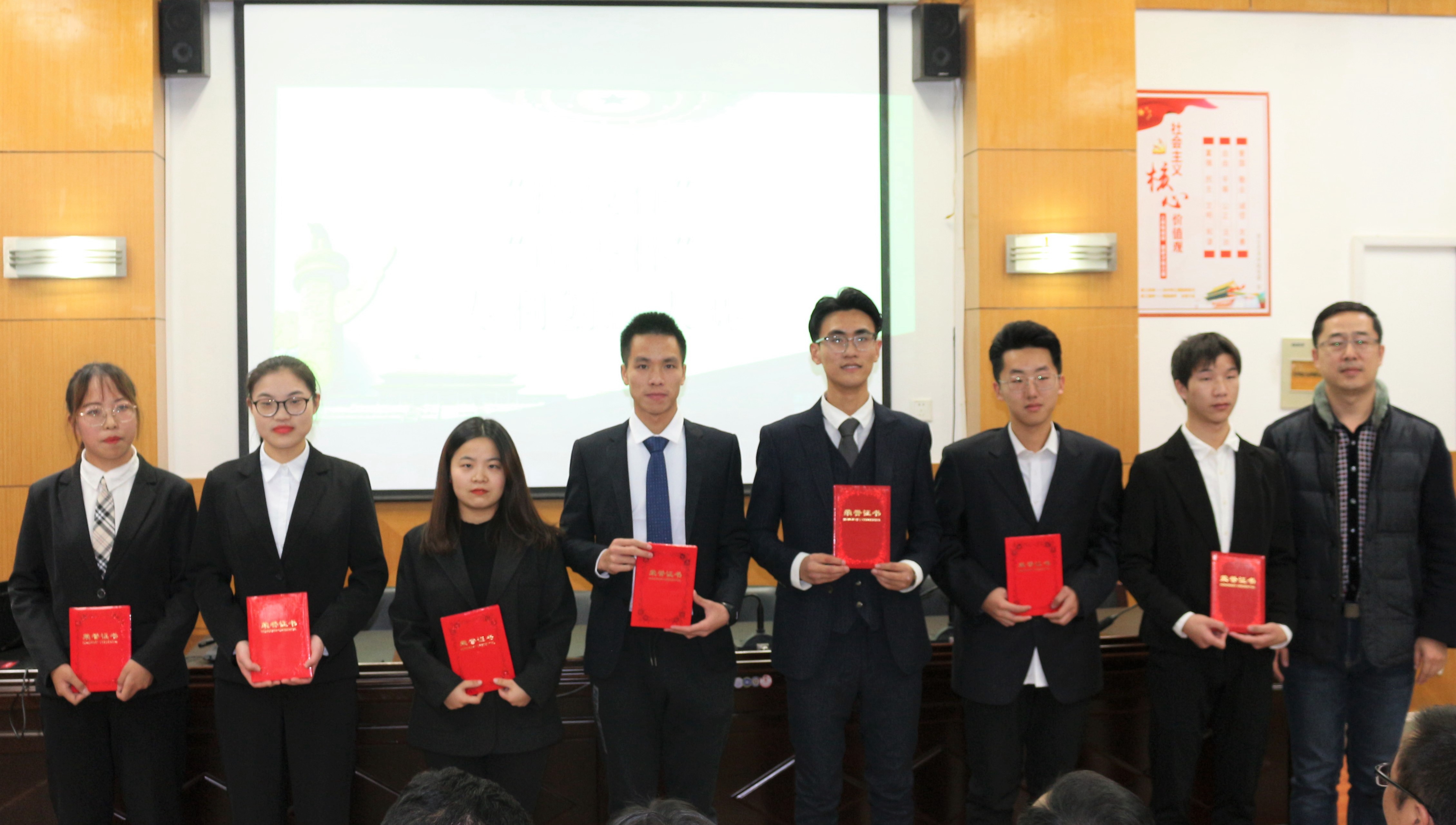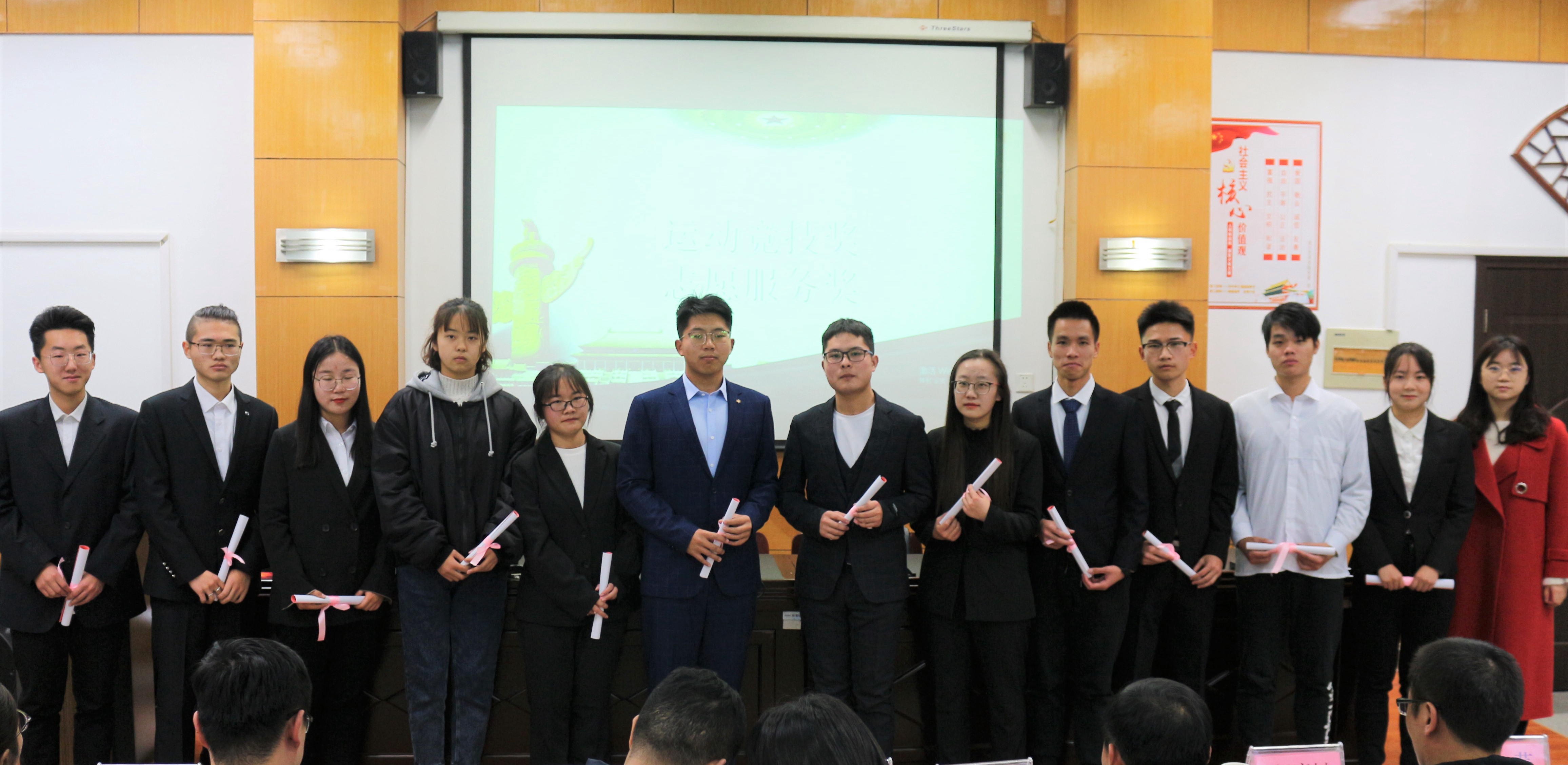 孙建光为在白昼的风和日丽中都始终屹立,拥有丰富的知识、完美的操守及一种对他人前途敢于承诺的责任的优秀班主任颁奖;胡庭树为共同努力、共同前进的先进班集体和优良学风班颁奖;于文天为用执着、勤奋的精神在挑战杯、专利等双创道路上取得丰硕成果的团队和个人颁奖。