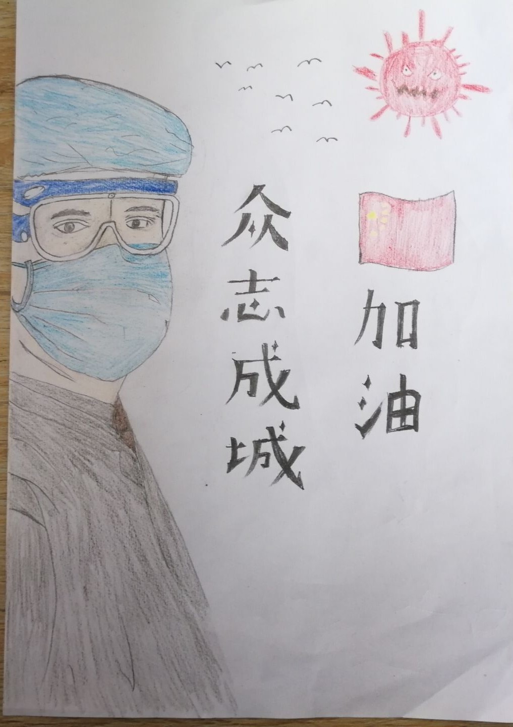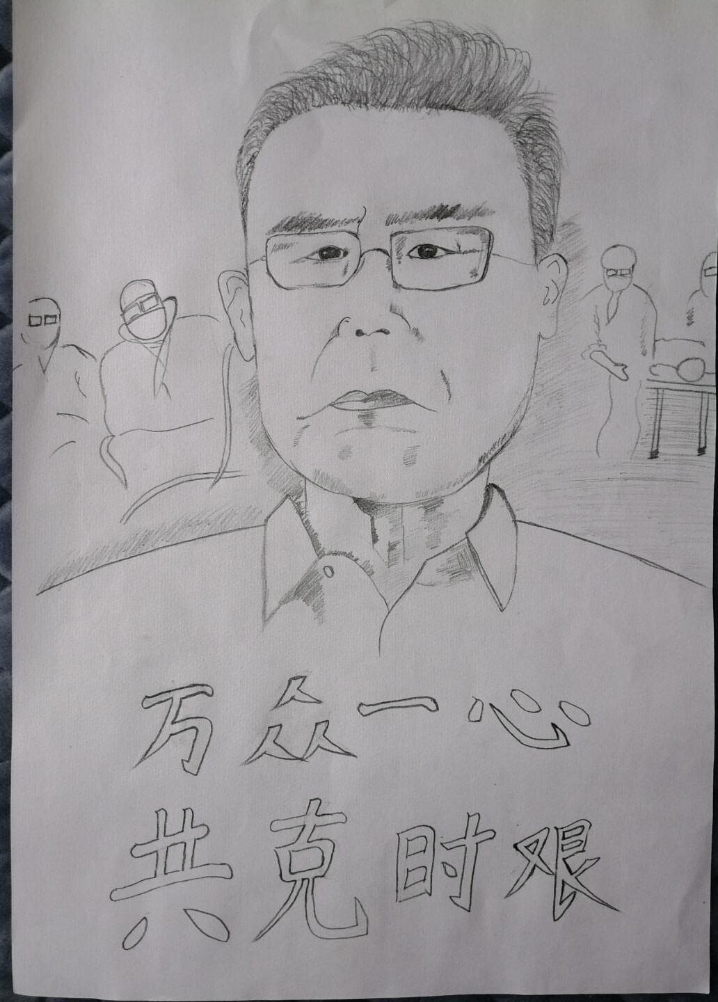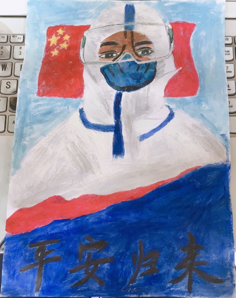 在这次绘画创作活动中,我们看到淮工的宿管阿姨们为员工忙碌一个个身影,看到了一名医生疲惫但眼神充满着必胜的信心,看到了白衣天使,不畏逆行。坚守岗位,无声付出,看到了全国各地的资源争分夺秒地驰援武汉,看到了数以万计的医生、护士、警察、基层民众投身于抗疫一线,他们用手为我们撑起了一片天。