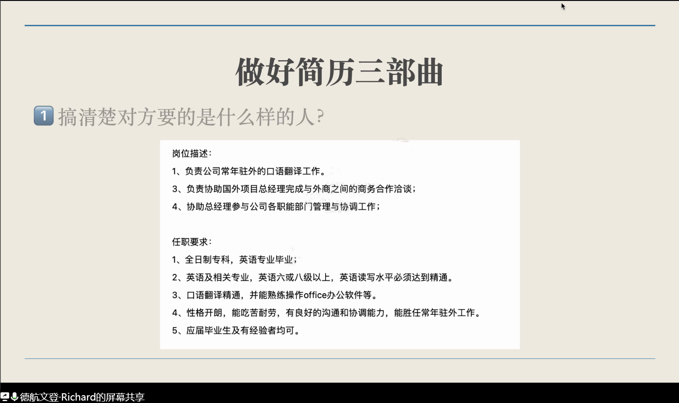 会议伊始,王健老师用一段简短的视频介绍了英专生的就业前景,并希望在就业之际大家能够树立正确的择业与就业观。接着,王健老师阐述了投稿简历的步骤以及考研的相关事宜。他强调努力很重要,努力的方向更重要,要学会展示优点,练就扎实本领。会议最后,王健老师表示,除了读研和就业,英专生还可以选择出国深造的方式,他鼓励同学们认真考虑,做出合适的选择。