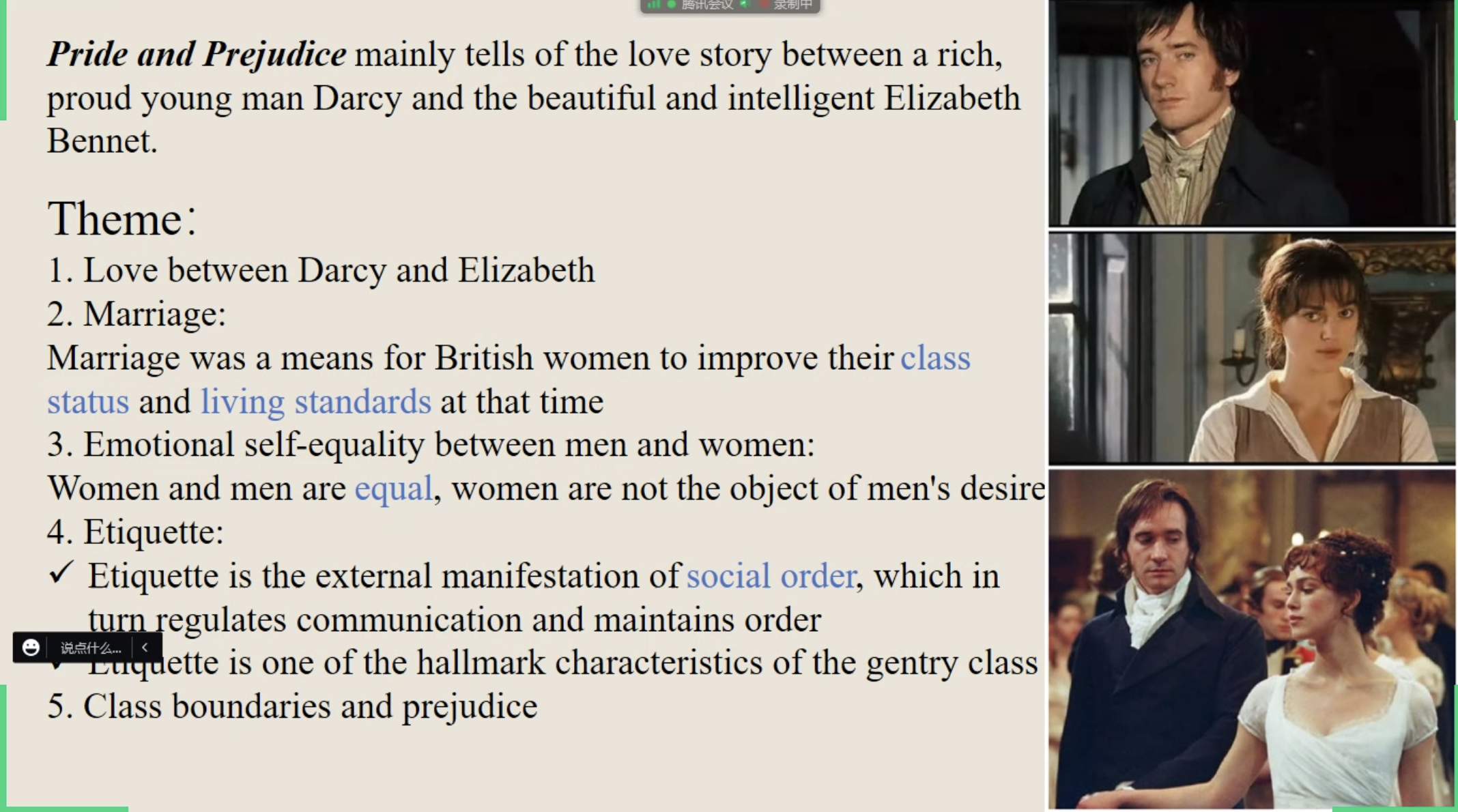 为培养同学们对文学经典的兴趣,增强文化修养和道德素质,营造书香校园,2022年4月27日15:00,云顶国际yd333于线上开展品读经典著作讲座。本次讲座邀请外籍教师海伦娜博士讲解英语名著《傲慢与偏见》。云顶国际yd333同学积极参与本次讲座。