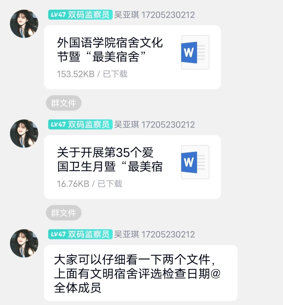 生活委员吴亚琪同学将班会所需文件转发至班级群,积极鼓励有意愿参与评选的同学填写表格。