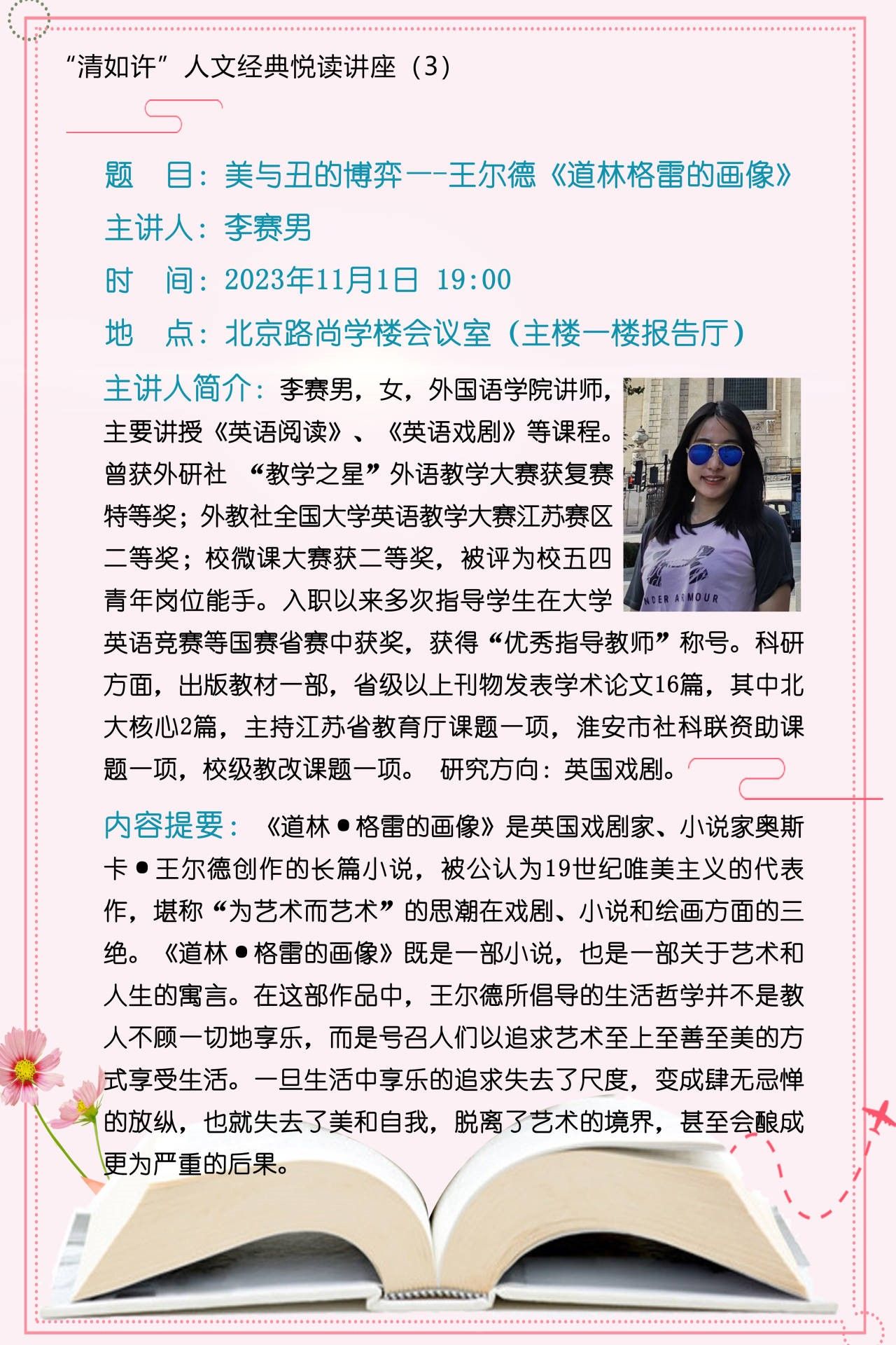 2023年11月1日下午19点,云顶国际yd333于北京路校区尚学楼一楼报告厅开展了以“美与丑的博弈:王尔德的《道林·格雷的画像》”为主题的“清如许”人文经典悦读讲座第三期。本次讲座邀请英语教育系教师李赛男担任主讲人,由副经理郁敏主持。公司全体大一员工参加了此次讲座。