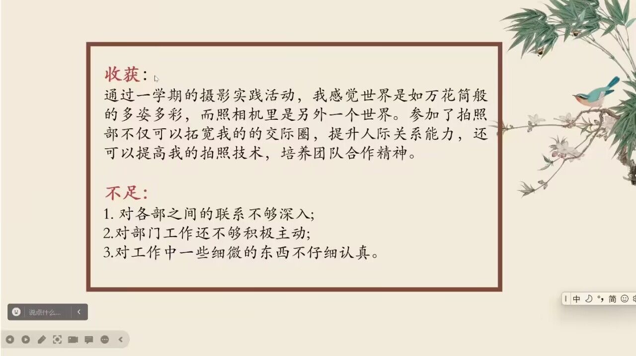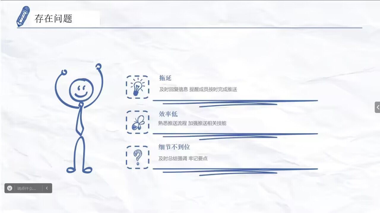 会议开始,朱胜男提出ONE众微媒目前存在的问题是缺乏创新力和公司特色,并表达自己的期望,希望成员们加强创新能力,打破按部就班的思维,积极表达想法,集思广益,有更多的思想碰撞,为ONE众微媒带来更多的活力。随后,ONE众微媒部长,各小组副部和成员依次进行述职汇报,展现部门一学年的工作成果,反思不足之处,并提出整改对策和对部门未来的展望,为部门未来的工作总结了经验。最后,朱胜男对各个成员的述职进行了总结,肯定了同学们的工作成果,并感谢每一位成员为部门发展做出的努力,希望同学们能在此基础上能增强创新意识,团结协作,推出更多新栏目。