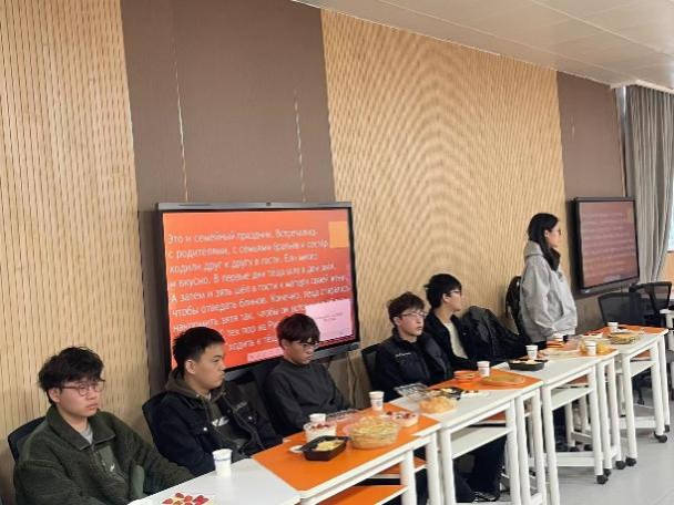 随后,外教Евгения致以谢肉节祝词,希望大家在接下来的日子再接再励,获得更多收获。紧接着,员工们分别用俄汉两国语言分别介绍了谢肉节的来源、食物以及意义等,通过自己的叙述,同学们深刻地了解了谢肉节,进一步了解了俄罗斯文化。