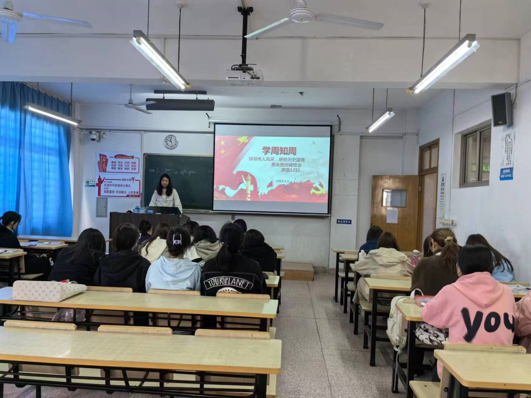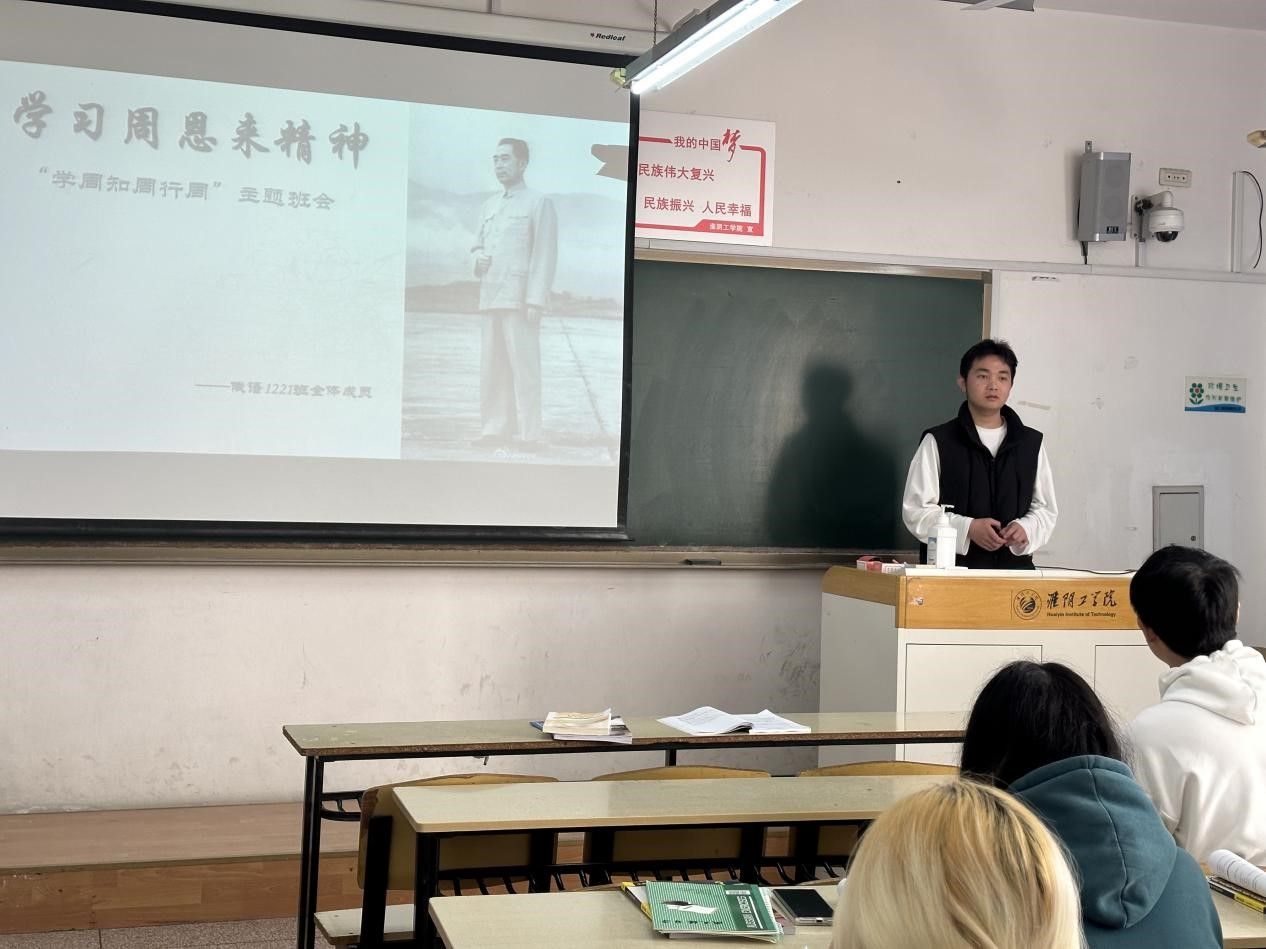 班会上同学们学习了周恩来总理伟大的一生:年少立志,一心为国,立下了“为中华之崛起而读书”的铮铮誓言;革命之时,他加入了中国共产党,浴血奋战,用双手捧起新中国的星星火苗;建国之后,他挑起党和国家的繁重事务,将一颗赤诚之心全部奉献给了人民,让祖国在世界之林真正挺起了胸膛。接着,同学们各自分享在周恩来童年读书处、周恩来纪念馆参观时的感想,对周恩来精神内涵进行了解读,使同学们深刻感受到了周恩来总理的崇高风范和伟大精神。班会的最后,班委向同学们发出了倡议,为每个班以后的发展制定了具体的目标以及努力方向,让同学们在学习的过程中传承周恩来精神。同时,加强积极进取、刻苦好学、团结协作、求真务实、勇于创新的学风建设,争取成为新时代有担当,有作为的青年。