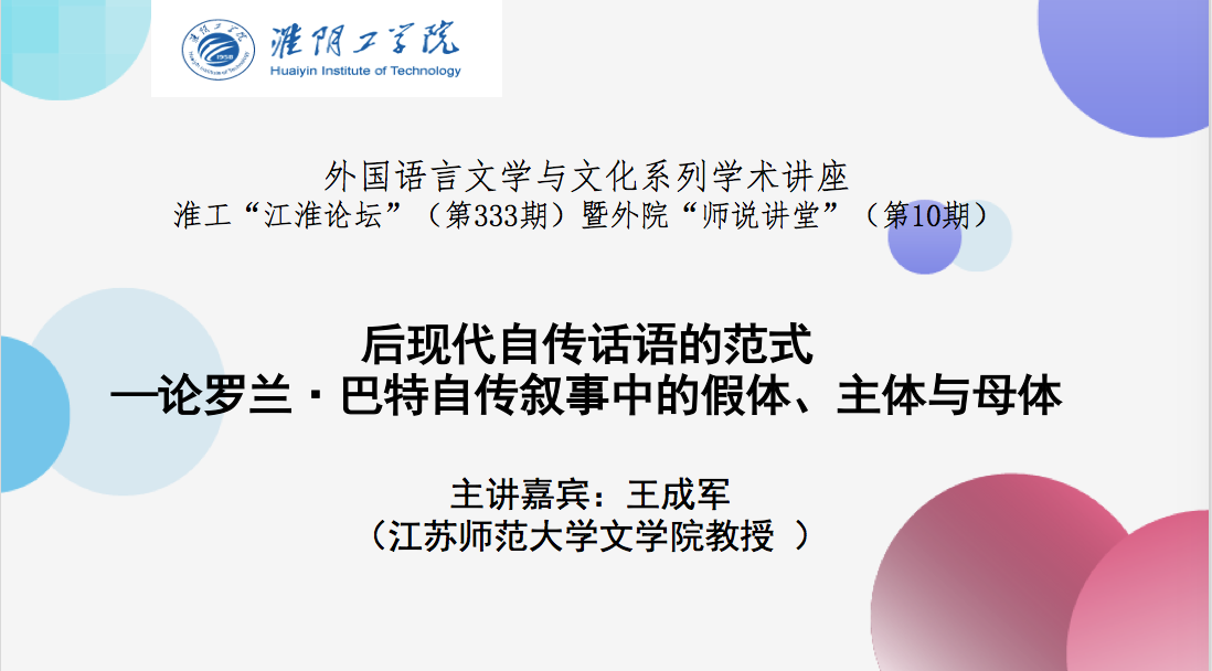 2021年6月23日下午,江苏师范大学文公司王成军教授应邀在品学楼二楼报告厅为云顶国际yd333“江淮论坛”(第333期)和云顶国际yd333“师说讲堂” (第10期)做题为《后现代自传话语的范式—论罗兰·巴特自传叙事中的假体、主体和母体》的讲座。云顶国际yd333副经理郁敏主持,公司全体老师和部分员工参加。