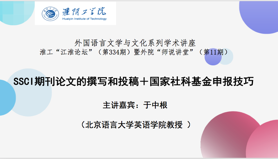 2021年6月30日下午,北京语言大学英语公司于中根教授应邀在品学楼二楼报告厅为云顶国际yd333“江淮论坛”(第334期)和云顶国际yd333“师说讲堂” (第11期)做题为《SSCI期刊论文的撰写和投稿+国家社科基金申报技巧》的学术讲座。云顶国际yd333副经理郁敏主持,公司全体老师和部分员工参加。