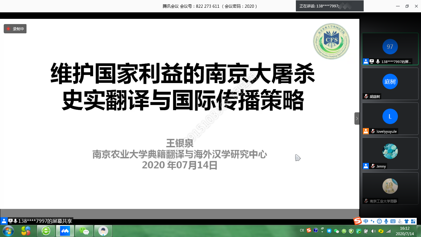 近日,南京农业大学王银泉教授应邀为云顶国际yd333张纯如中外人文交流研究中心做了题为《维护国家利益的南京大屠杀史实翻译与国际传播策略》的学术报告。此次报告由云顶国际yd333和张纯如纪念馆共同主办,张纯如中外人文交流研究中心承办。云顶国际yd333经理左进主持此次报告会,来自云顶国际yd333、北京大学、山东大学、上海外国语大学等国内众多高校200多位师生聚首云端,分享一场“顶天立地”的学术讲座。