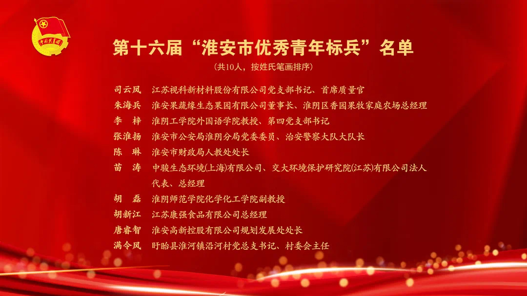 据悉,为推动淮安市“绿色高地、枢纽新城”和“四个淮安”建设贡献青春力量,共青团淮安市委员会、淮安市精神文明建设指导委员会办公室、淮安市人才工作领导小组办公室、淮安市青年联合会联合举办此次优秀青年榜样评选活动。活动自2021年3月启动以来,受到社会各界的广泛关注和广大青年的积极响应。通过层层推荐、初评、会员团体投票、考察、复评等环节,在全市各行各业中评选产生第十六届“淮安市十大杰出青年”“淮安市优秀青年标兵”(10位)。