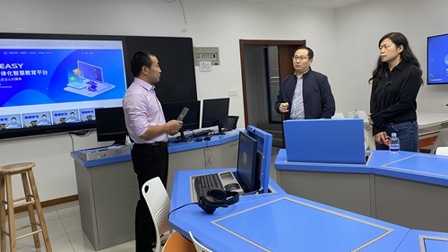 14日下午,孙经理一行来到鼎傲科技有限公司。鼎傲公司近年来一直致力于专业语言实验室开发与建设,双方在语言实验室建设、线上线下教学安排、智慧教学平台搭建、校企合作共建课程等方面进行了深入的交流,并参观了公司新型智慧教室样板间和企业自主研发的外语一体化智慧教学平台。