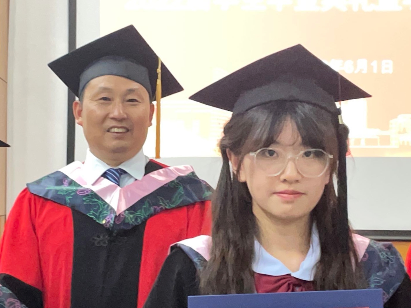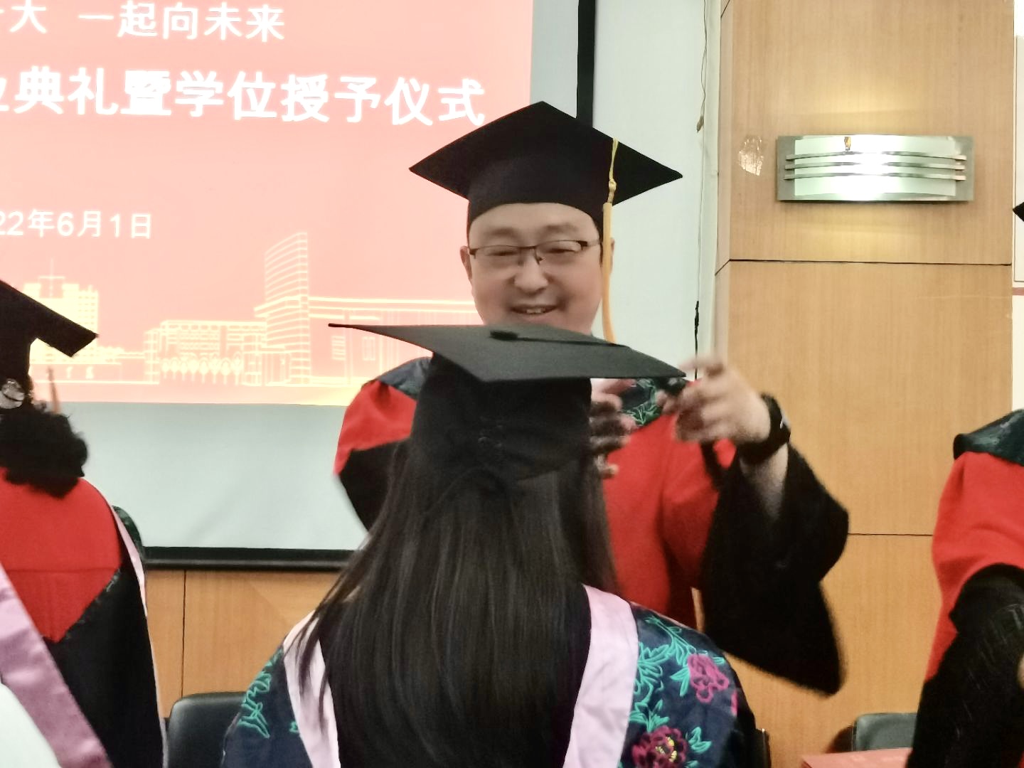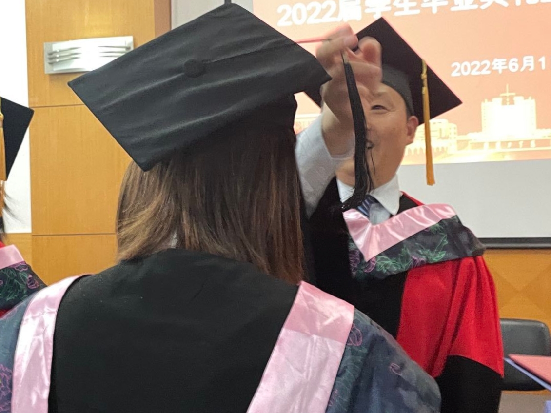 学士学位授予仪式上,2022届毕业生们身着学士服,依次走上主席台。导师们为毕业生们拨流苏、颁发学位证书并亲切握手合影留念。