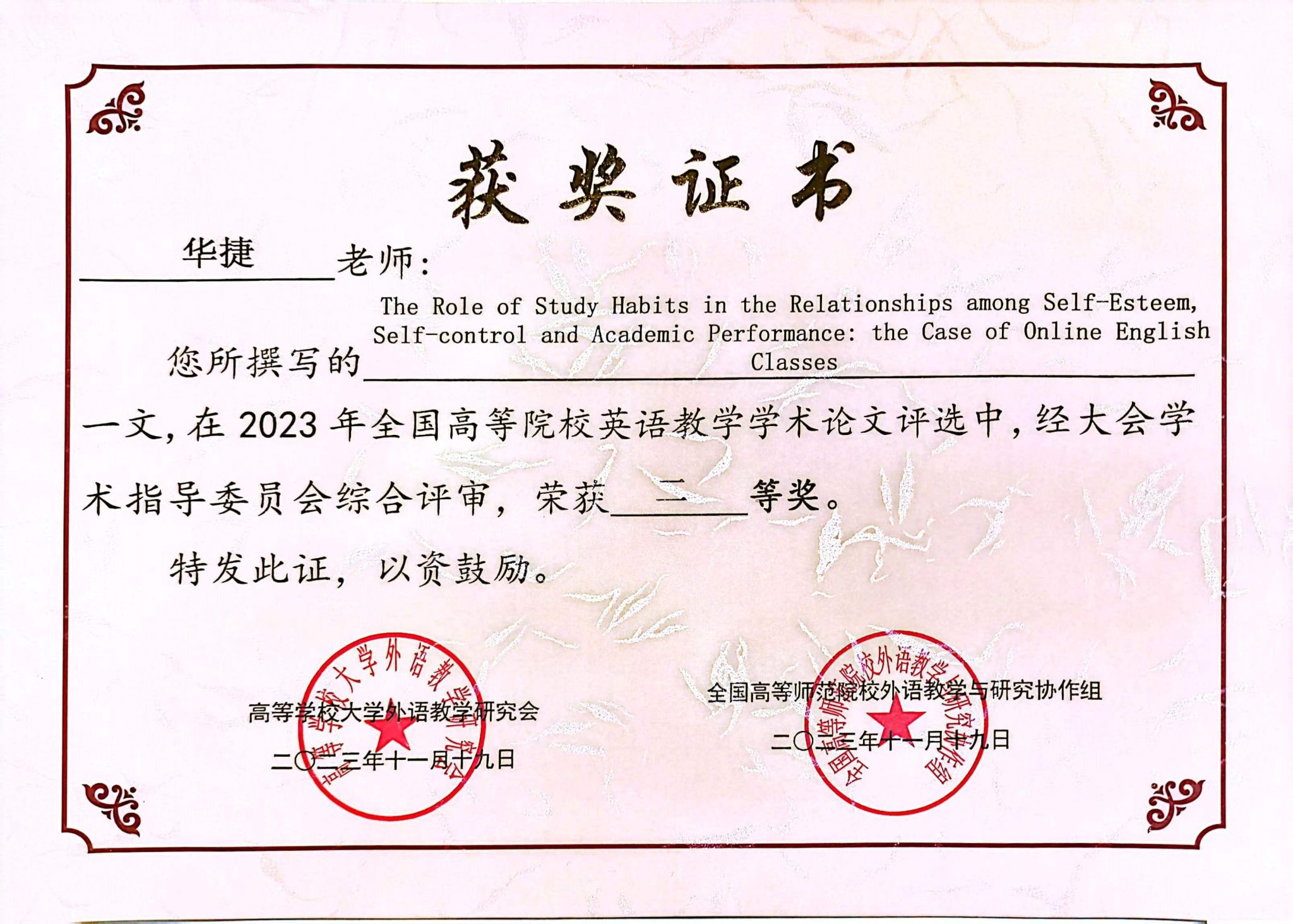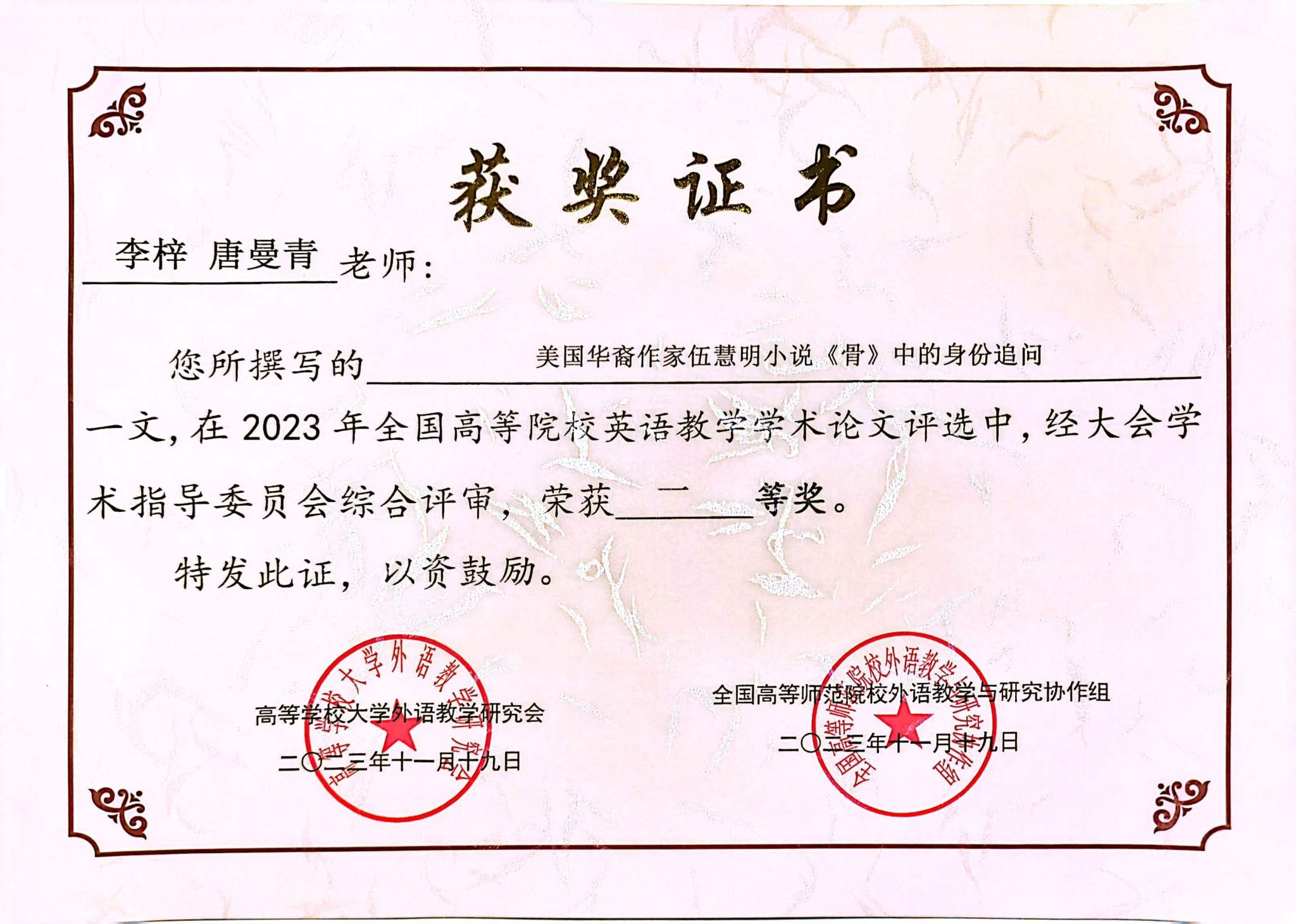 此外,大赛还组织了2023年全国高等院校英语教学学术论文评选,其中李梓、唐曼青老师合作的论文荣获一等奖,华捷老师的论文荣获二等奖。