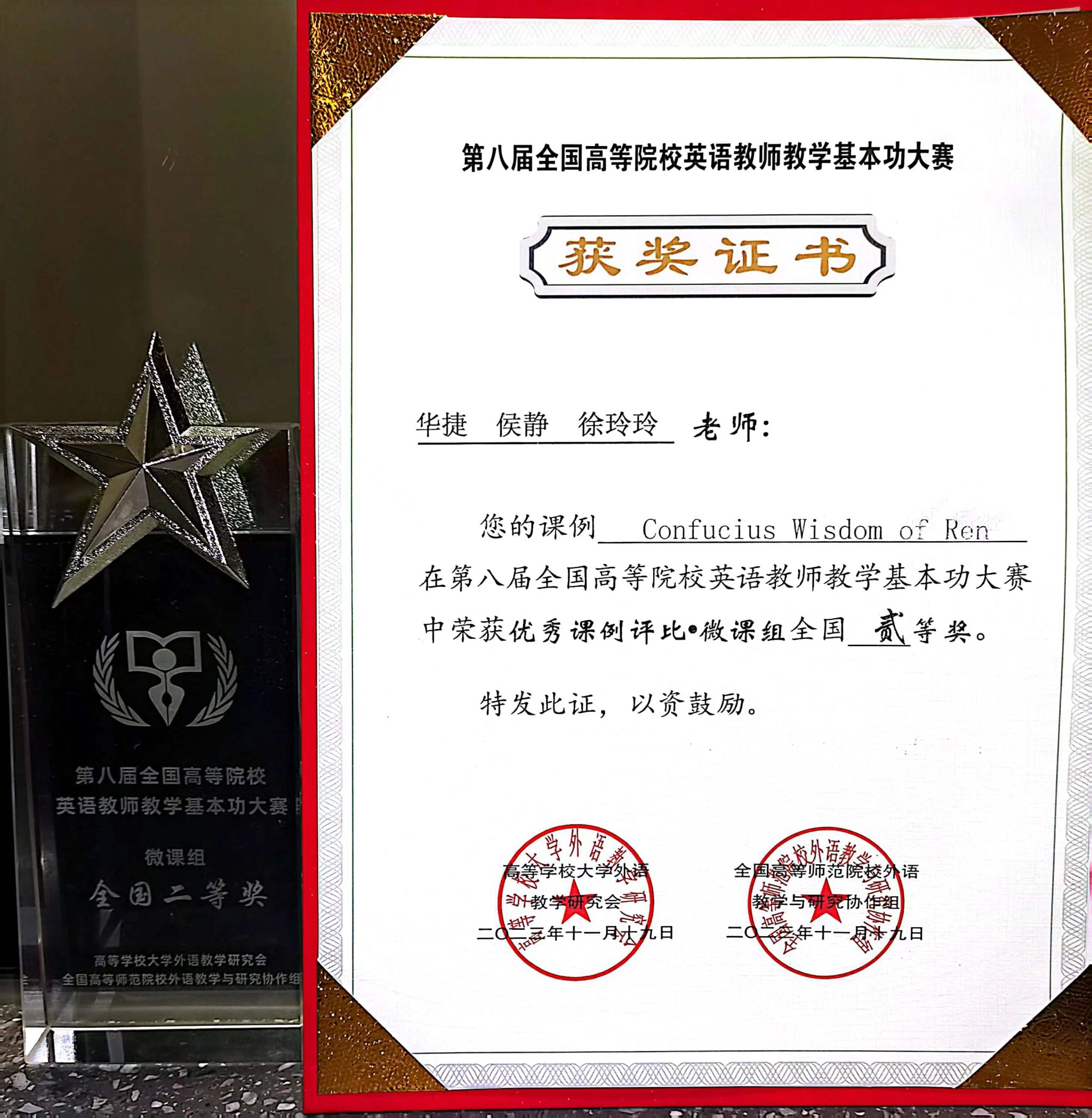 公司共选送两部作品参赛,均荣获佳绩。其中,华捷老师团队(华捷、侯静、徐玲玲)的微课作品“Confucius Wisdom of Ren”荣获全国二等奖,马星宇老师团队(马星宇、杨琴、王春梅)的微课作品《大运河的水工》荣获全国三等奖。