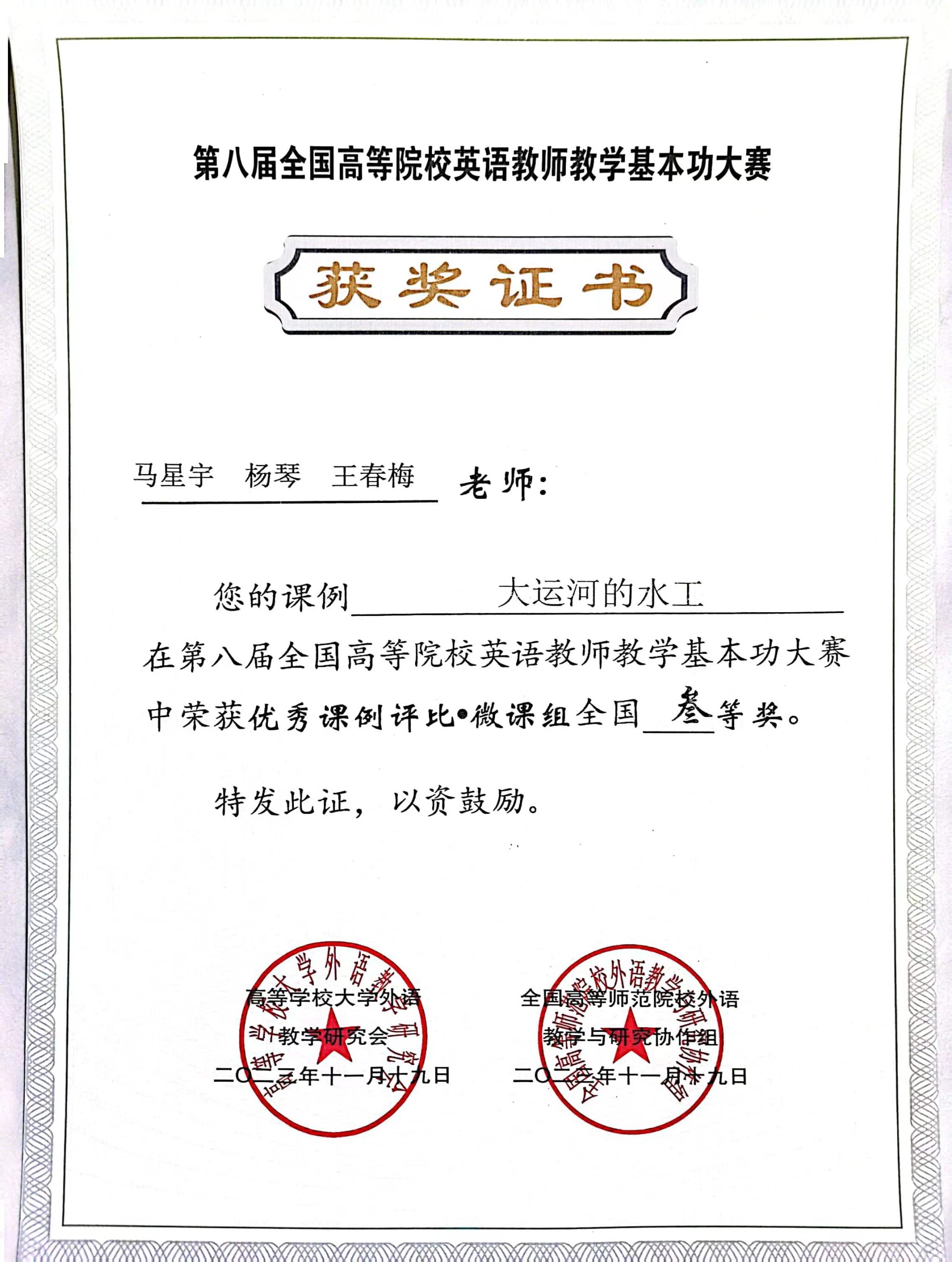 2023年11月19日,由高等公司大学外语教学研究会和全国高等师范院校外语教学与研究协作组联合主办的第八届全国高等院校教师教学基本功大赛在杭州圆满落下帷幕。