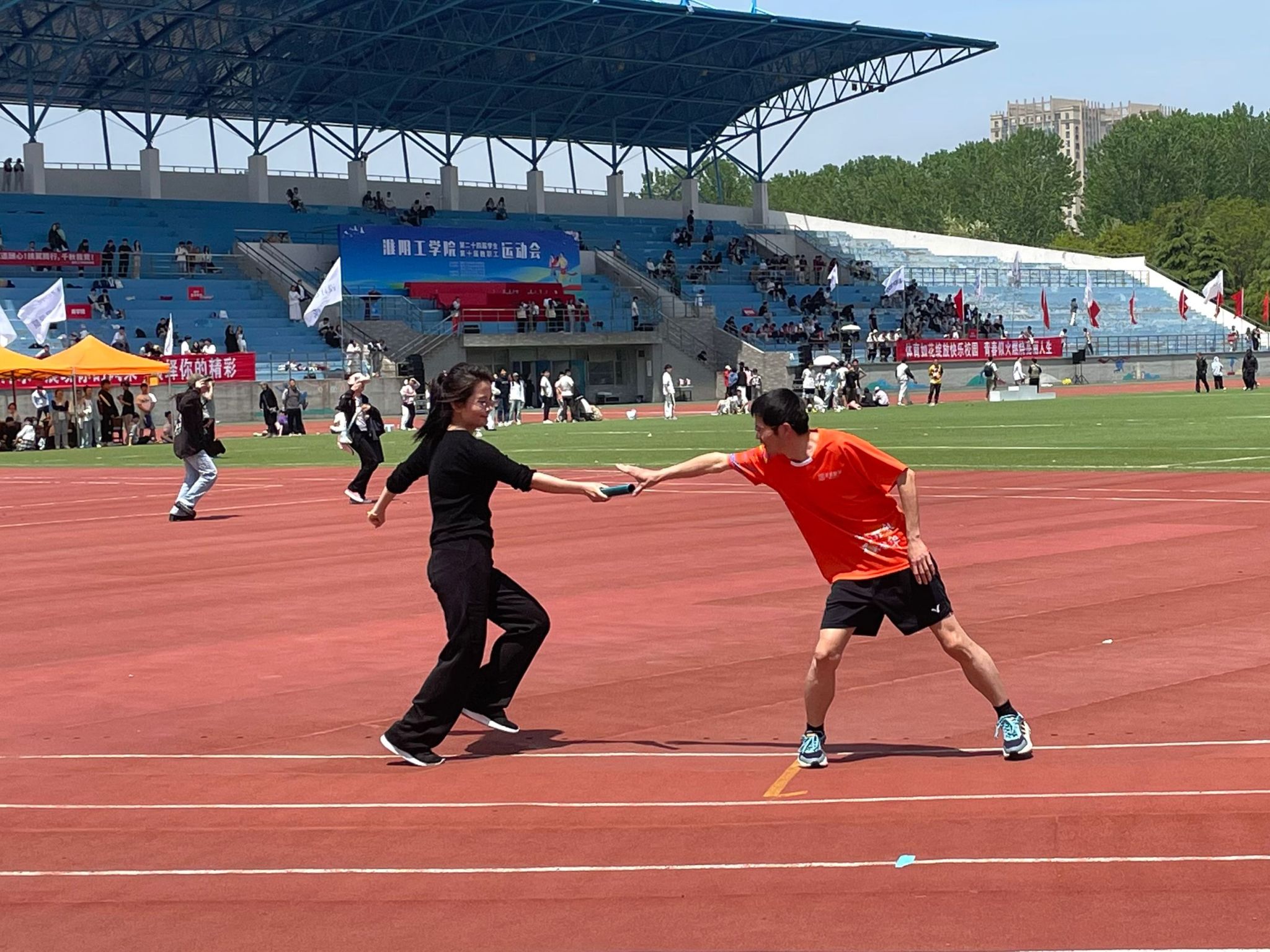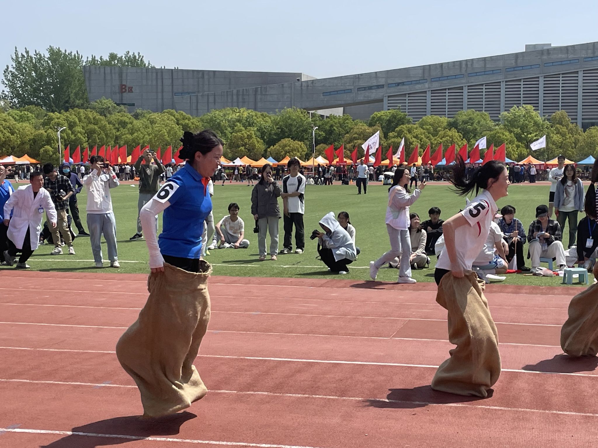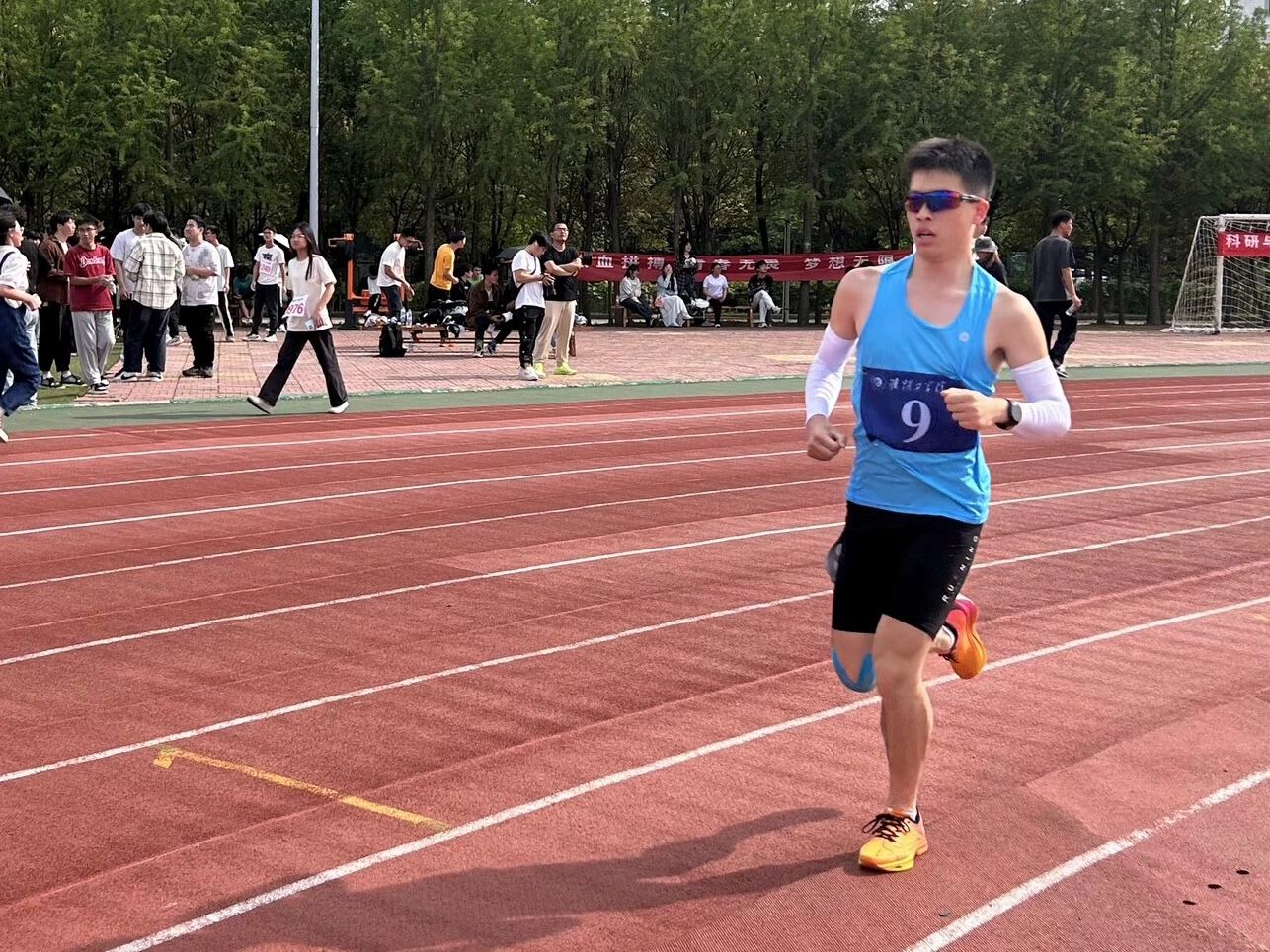 看他们矫健身姿,跳跃着向前冲。教师们在课堂上辛勤地给我们传授知识,展现出他们的博学和敬业;赛场上,他们也显得毫不逊色,展现他们的强健体魄。尽管束缚了双腿,但并没有阻碍他们的前进。用跳跃代替飞奔的脚步,用信念舞出最后的成功。