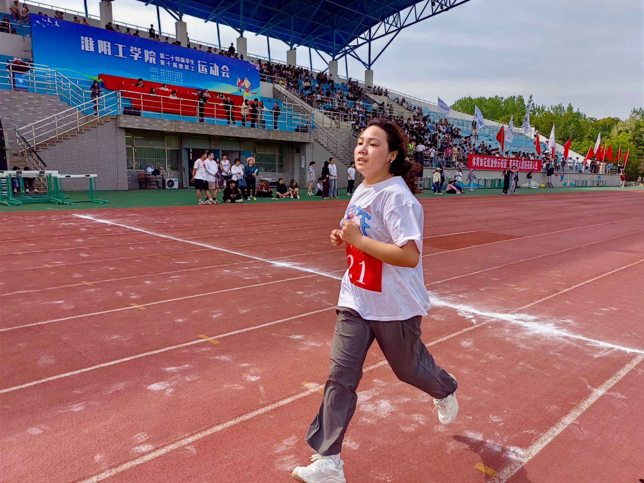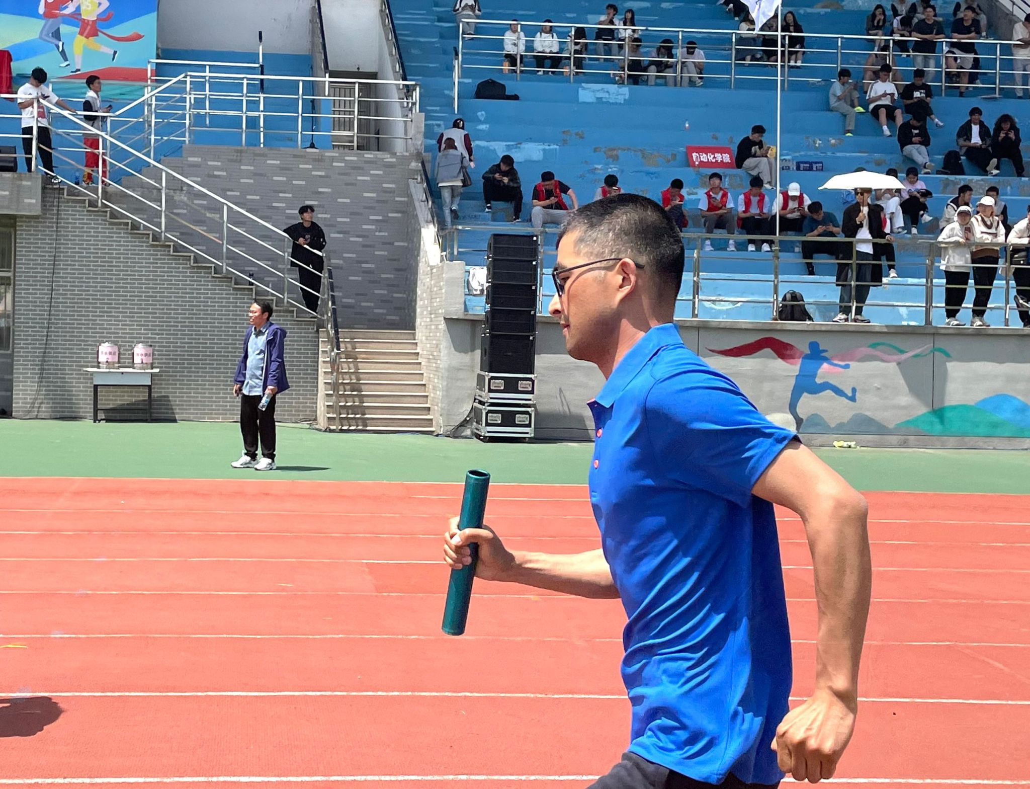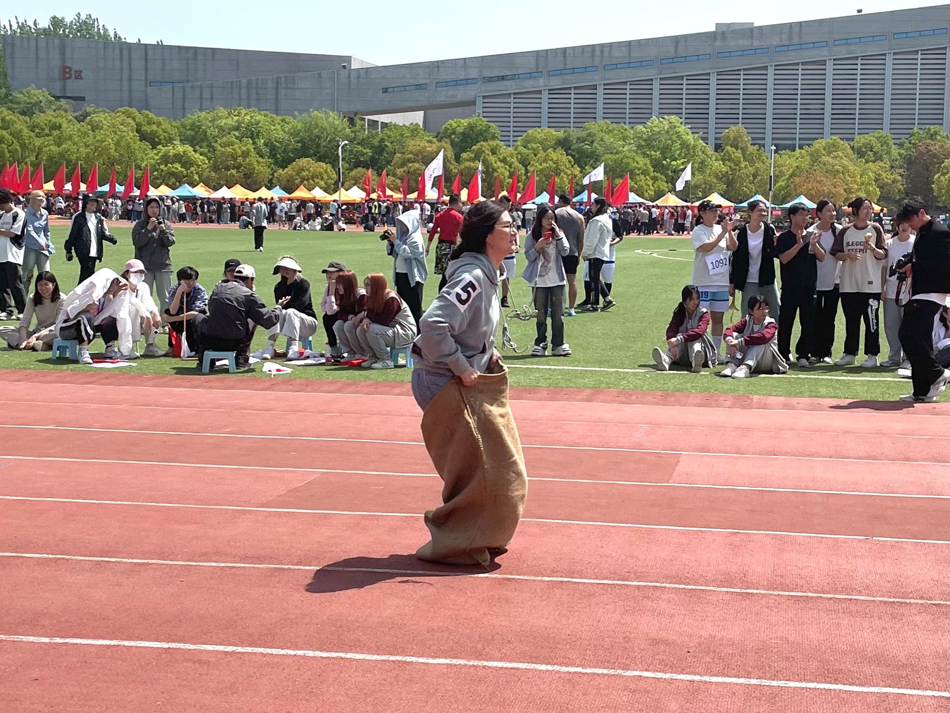 看他们矫健身姿,跳跃着向前冲。教师们在课堂上辛勤地给我们传授知识,展现出他们的博学和敬业;赛场上,他们也显得毫不逊色,展现他们的强健体魄。尽管束缚了双腿,但并没有阻碍他们的前进。用跳跃代替飞奔的脚步,用信念舞出最后的成功。