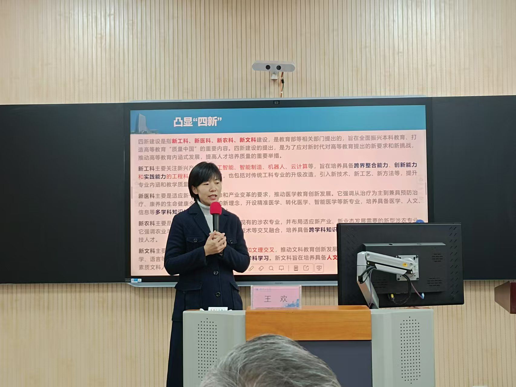王欢博士作了题为“新文科背景下专业外语课程教学的创新之道”专题分享,从精选课程、组建团队、找准痛点、提炼特色、解决问题等方面,分享了备战教师教学创新大赛的宝贵经验。并以参赛课程《高级英语1》教学设计创新汇报为例,展示了课程团队在课程内容重构、教学方法创新、教学环境创设以及教学评价改革等方面的实践做法,为与会老师们提供了宝贵的建议。