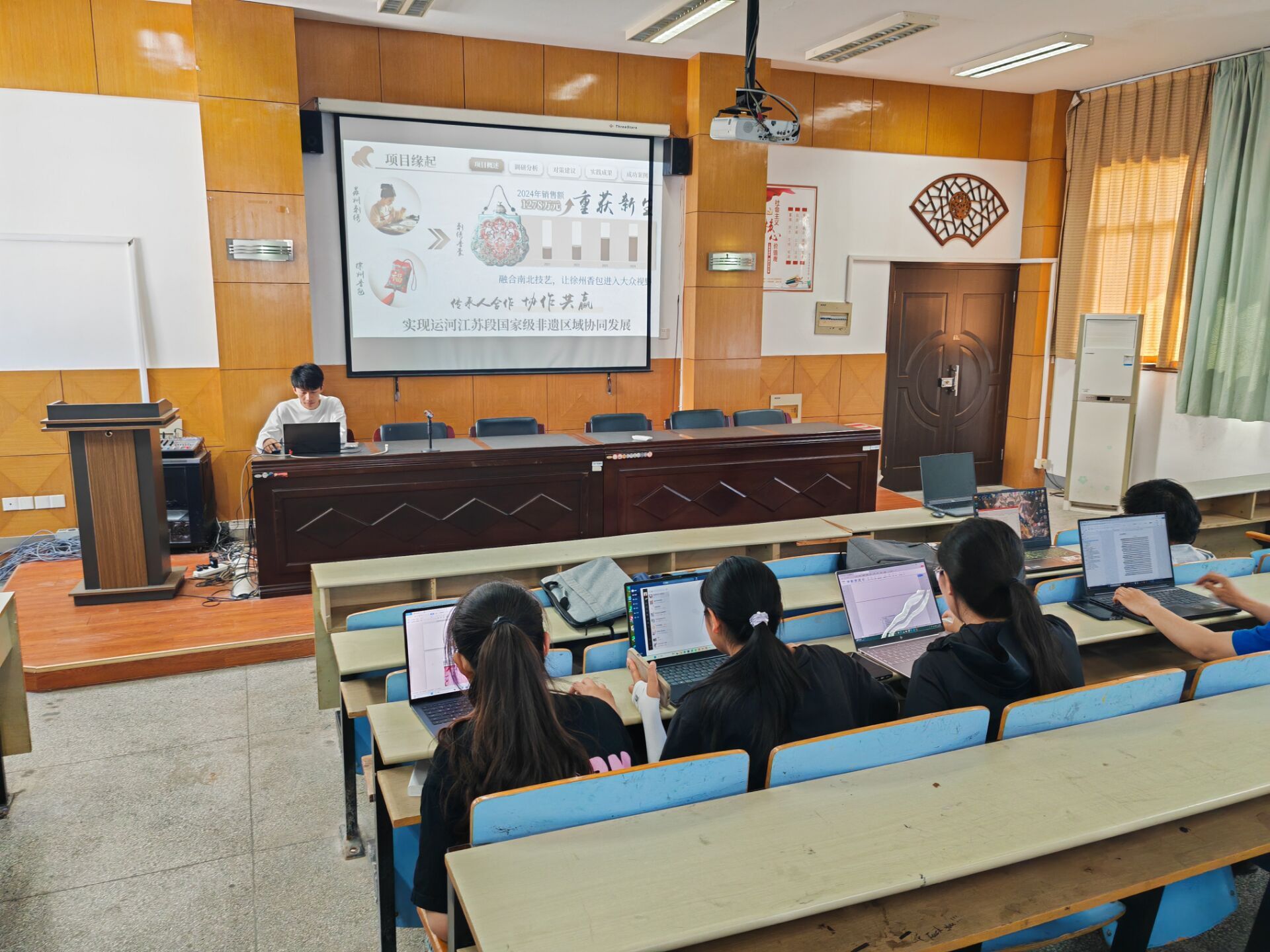 本次选拔赛自启动以来,受到全院师生的广泛关注。各团队围绕文化传承、语言服务、跨文化传播等主题展开研究,最终10支队伍进入院级决赛。在答辩环节,《大运河非遗研究》团队通过双语PPT、非遗实物展示及区域协同模型,系统分析了大运河沿线非遗保护的现状,提出“数字化传承+多语种传播”的创新路径。评委组充分肯定其“学科交叉特色鲜明,服务国家战略需求”的选题价值,并就数据样本优化、政策落地可行性等方面提出建议。