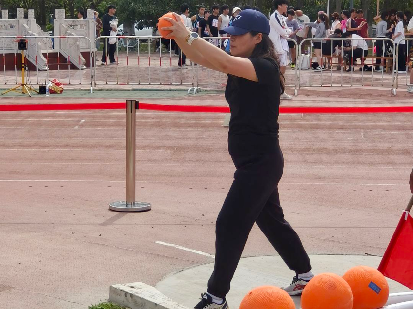 裁判哨声刚落,老师们跨步站上投掷区。他们先深吸一口气,弯腰抱起沉甸甸的实心球,双臂肌肉瞬间绷紧。猛地后仰,腰腹发力带动全身,脖颈青筋暴起,实心球如炮弹般破空而出。球划过一道凌厉的弧线,在空中画出黑色残影,落地时"砰"的一声砸进沙坑,溅起大片沙粒。
