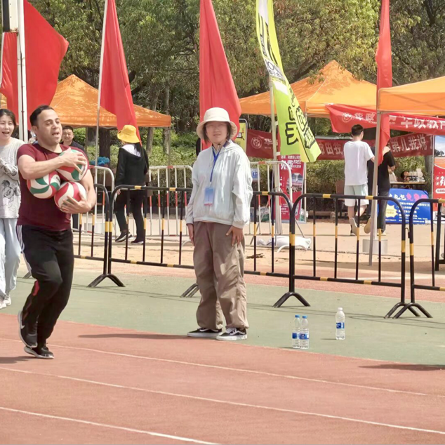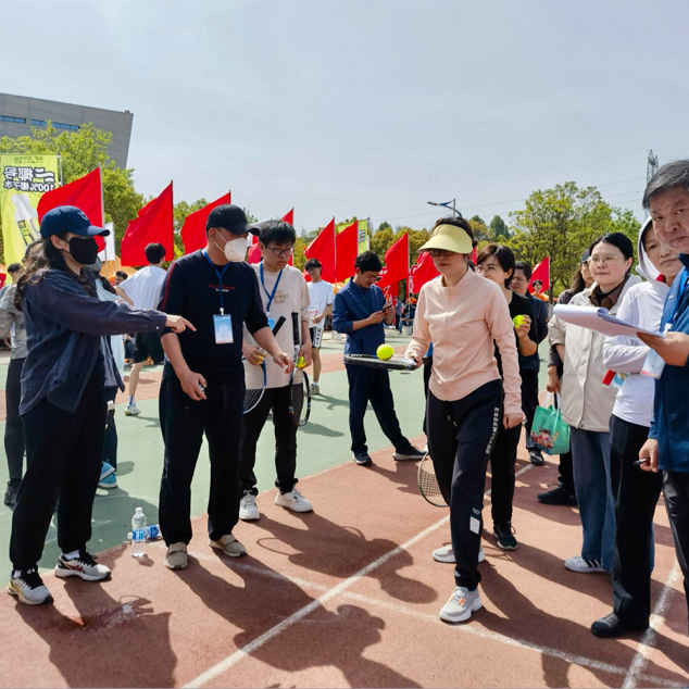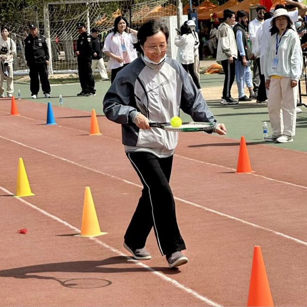 发令哨响,三十余位教师齐刷刷单手持拍托起网球,仿佛托起一颗颗跃动的银星。塑胶跑道上,细碎的脚步声与球拍的震颤声交织成独特韵律,有人重心放低,像捧着易碎珍宝般缓步疾行;有人步伐稳健,球拍微微倾斜,网球竟听话地在拍面中央旋转。老师步伐矫健,每一步都精准控制着节奏,网球在球拍上仿佛被无形的手固定住。