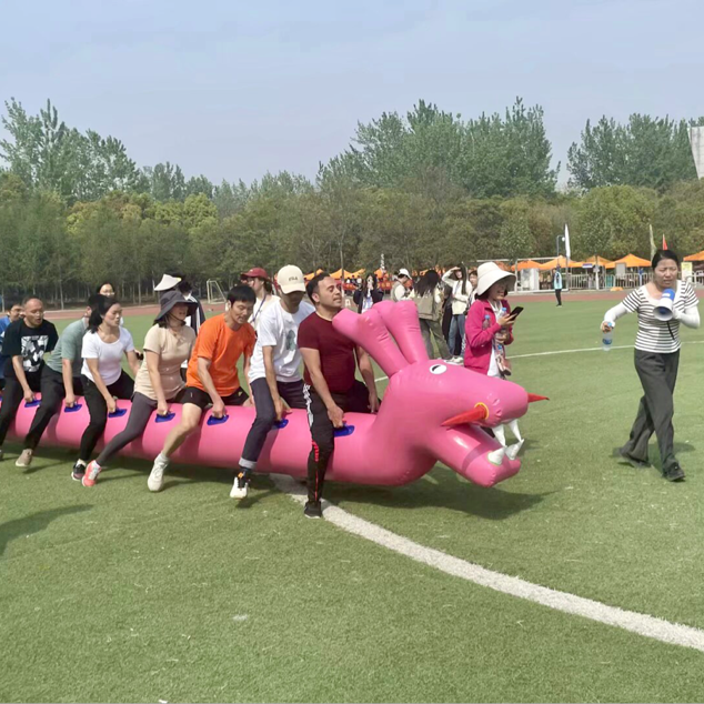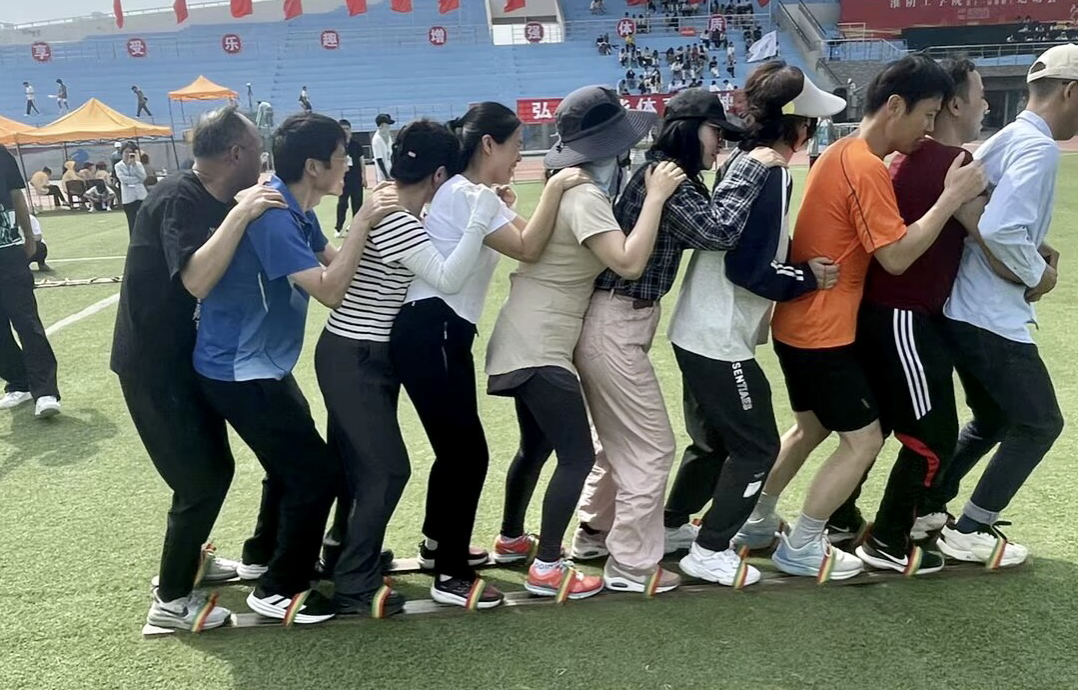 参赛的教师小队踏上“同舟共济”的道具。所有人手臂紧扣,齐声喊着“一二、一二”,小心翼翼地抬脚挪板。队伍配合默契,动作整齐划一,木板在地面平稳滑动。终点线前,各队拼尽全力,木板与地面摩擦发出刺耳声响,率先抵达的队伍欢呼雀跃,紧紧相拥,整个赛场洋溢着热烈欢腾的气息。