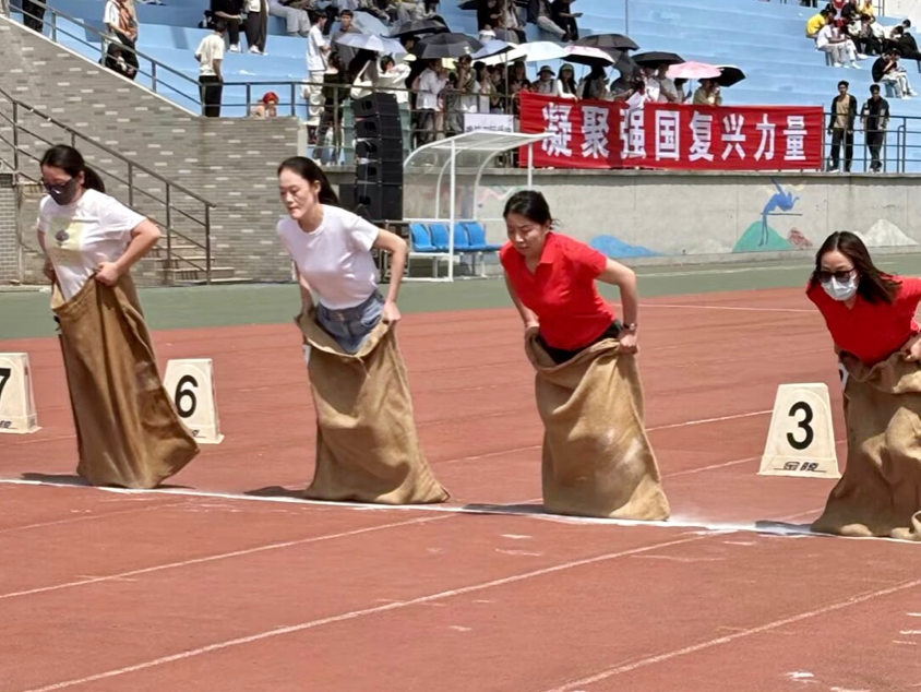 参赛教师们“扑通”跳进麻袋,瞬间化身灵活的“袋鼠”。双腿猛地一蹬,整个人高高弹起,麻袋随之鼓成饱满的半圆。他们身轻如燕,蹦跳间还能保持平衡,身后扬起细碎的草屑,赛道上,此起彼伏的蹦跳声与欢笑声交织。