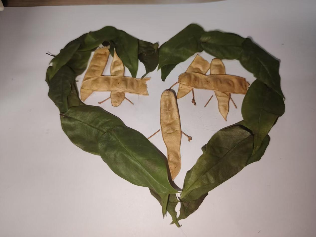 这幅植物拼贴画是我们宿舍小伙伴共同的创意结晶 。在宿舍里,大家常漫步校园收集掉落的树叶、豆荚。这幅作品以心形叶片勾勒外框,象征着我们宿舍成员间温暖又紧密的情谊 。内部用豆荚拼出小人模样,好似我们几个室友在宿舍里嬉笑玩闹 。它不仅是宿舍生活趣味的体现,更代表着我们一起度过的美好时光,是宿舍独特氛围与深厚友谊的生动象征 。